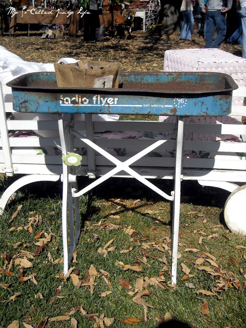An old wagon, especially a rusty one, would be perfect repurposed as a planter in the backyard.  You could fill it with dirt {a plastic liner might keep it from rusting} or just set pots right inside.