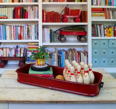This wagon turned into a tray is such a fun idea and a great way to add some color to a room.  I love the vintage feel.  The additional wagons on the shelf in the background also add a fun and playful element to the room.