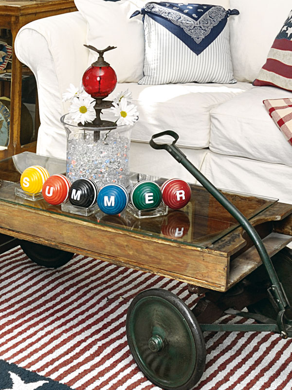 An old wooden wagon repurposed as a coffee table is just so cute.  A piece of glass gives it an even, flat top but you could skip the glass and just set items directly in the wagon.
