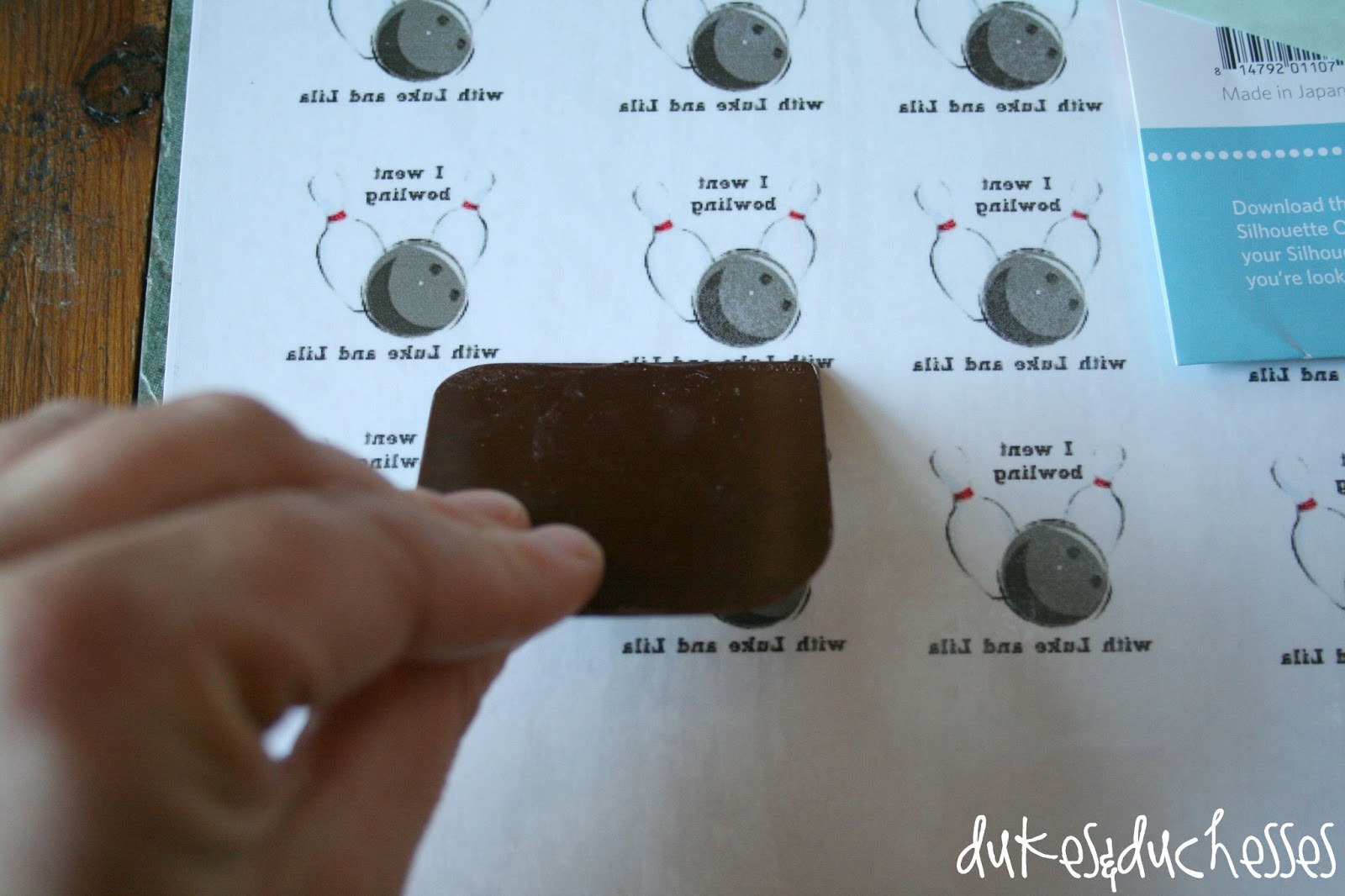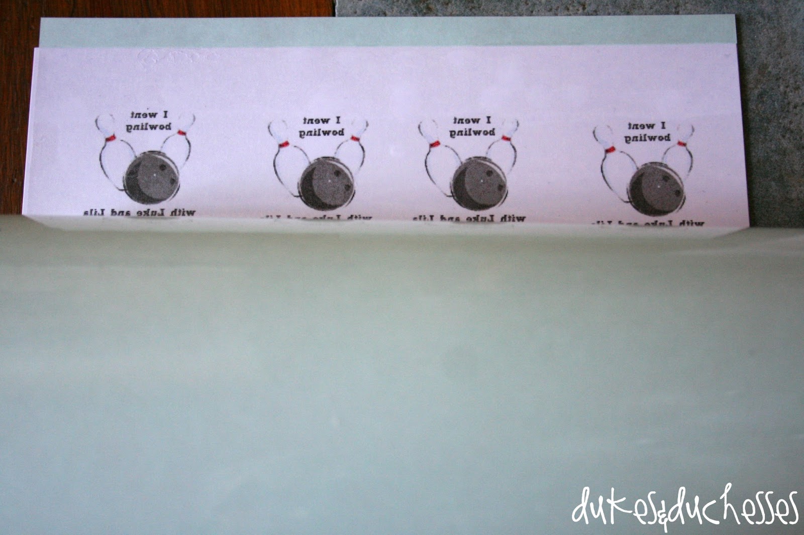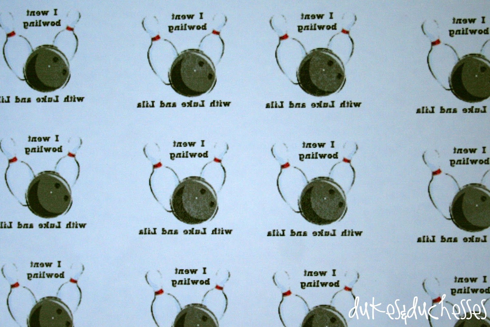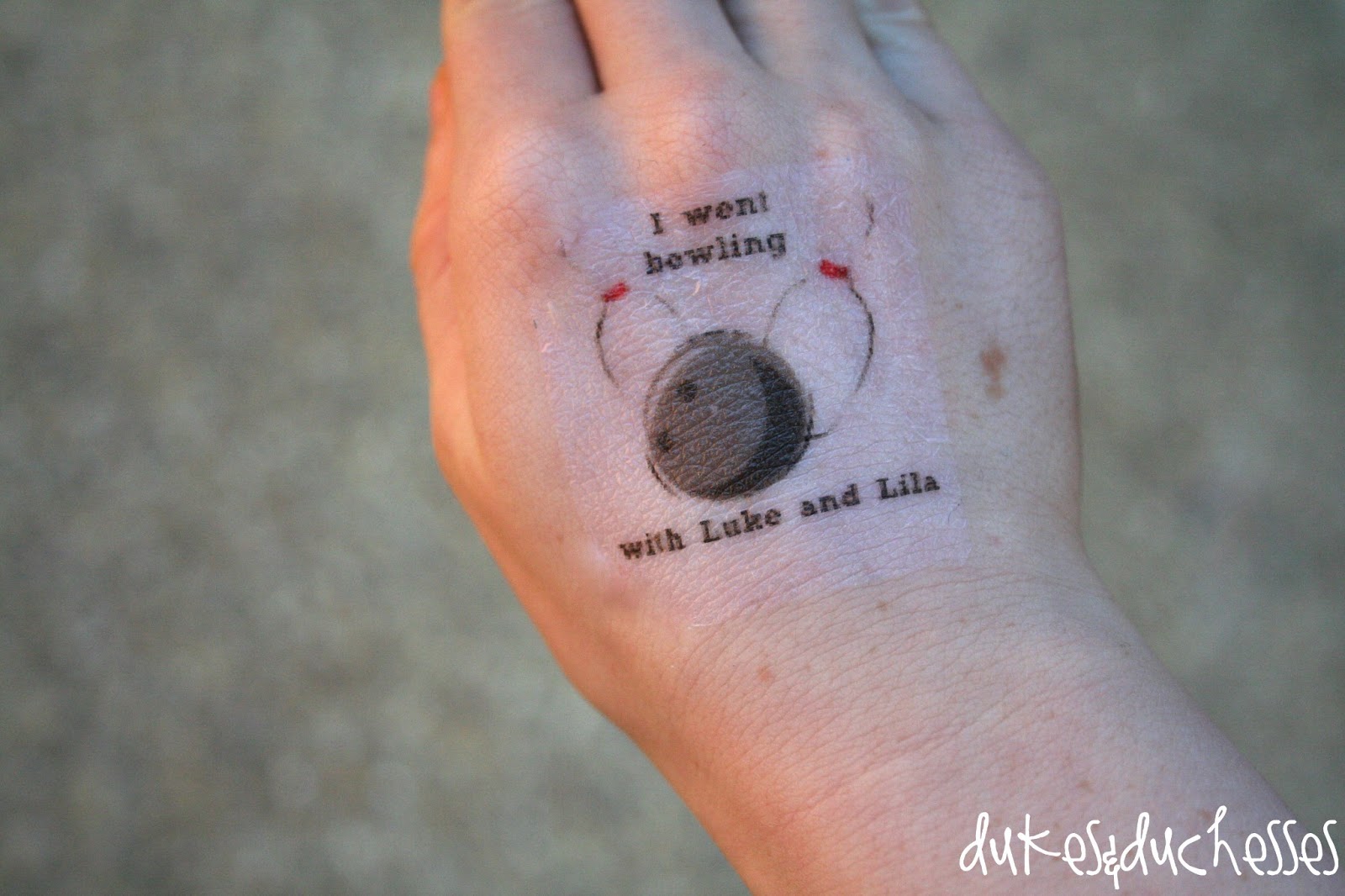 I designed these tattoos by using an online image, downloading it into Photoshop Elements, and adding text. Before printing on the tattoo paper, the image has to be flipped so the text is mirrored. {These tattoos say, “I went bowling with Luke and Lila”.}