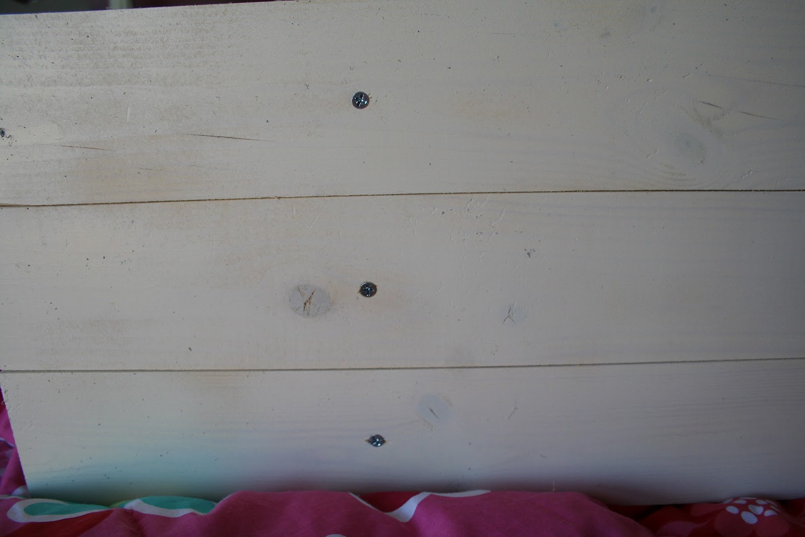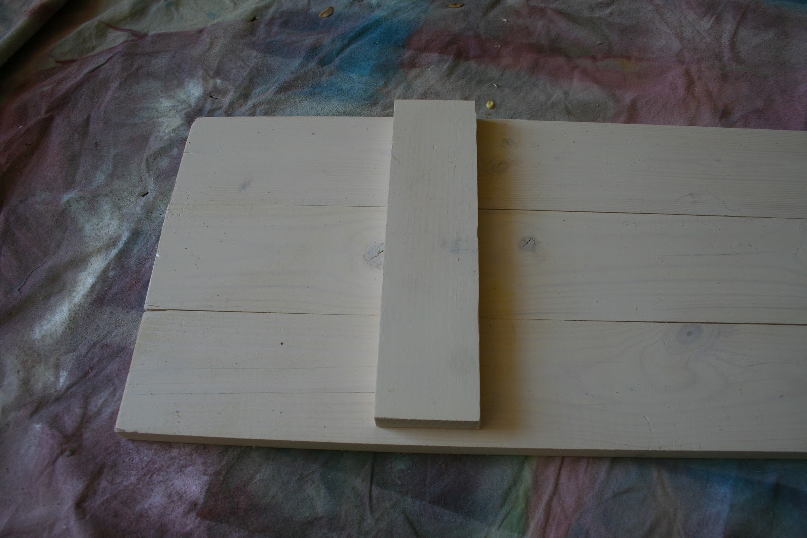 I also used a piece of wood from my scrap stash and cut two pieces that fit across the width of the boards {the cross pieces shown below are shorter than the ones I ultimately used … the final pieces were just half an inch shorter than the full width of three boards together}.