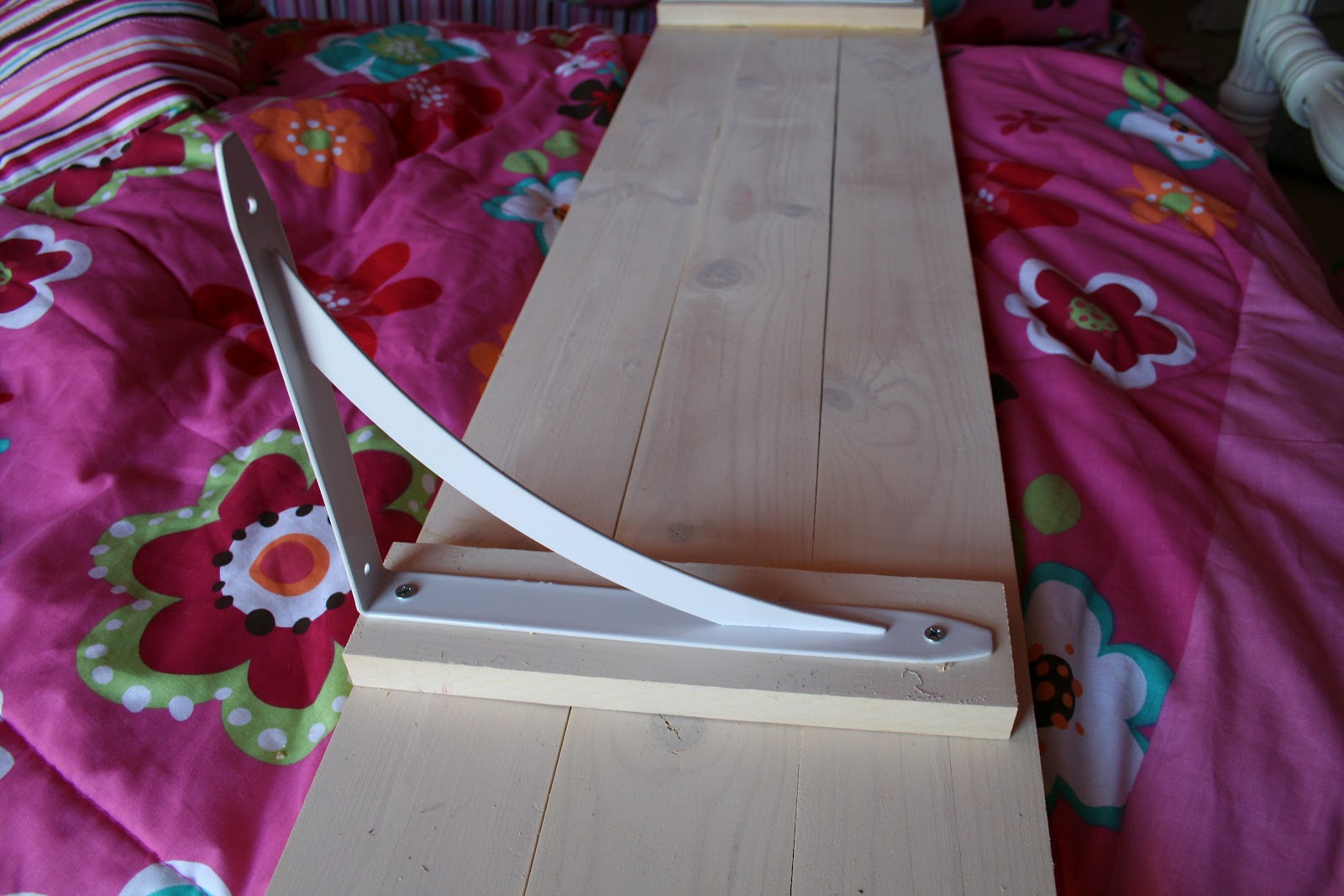 The last step of preparation was to screw the shelf bracket into place, keeping it even with the back of the shelf.