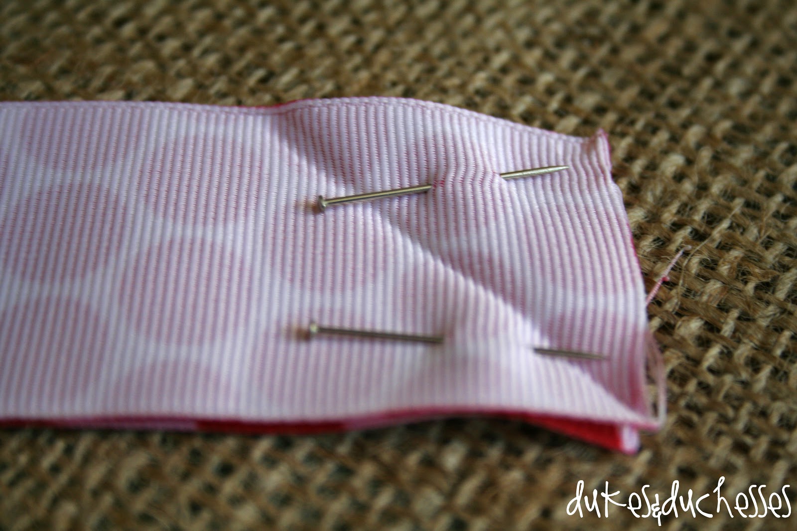 Pin the ribbon with right sides together and stitch across the ironed line.