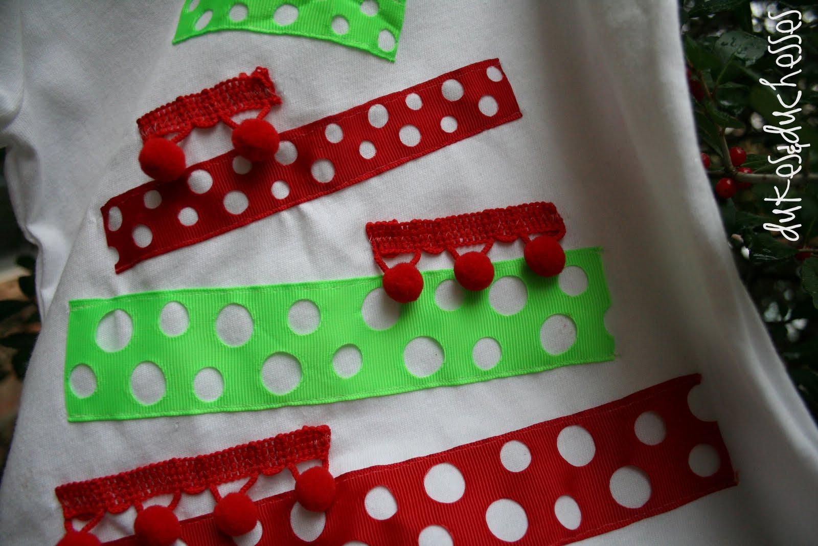 Every year in Canton I see shirts adorned with ribbon Christmas trees. I set out to make something similar but decided to slant my ribbon instead of laying it all out in parallel rows. Isn’t that hole-y ribbon cute? I picked it up in Canton, knowing it would be perfect for this project.