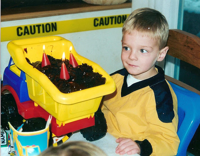 The cake was a dirt cake served from the back of a dump truck with construction cone candles.