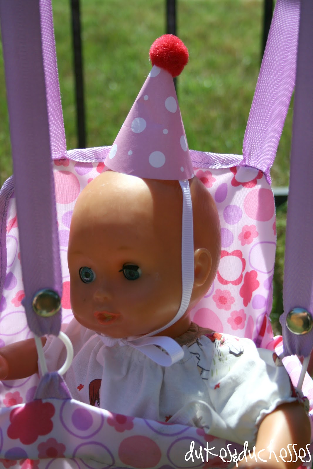 The party guests all brought dolls with them and we gave the babies fun little homemade paper hats to wear. To make the hats, I rolled scrapbook paper into a cone shape and hot glued a pom pom on top and ribbon ties to the inside.