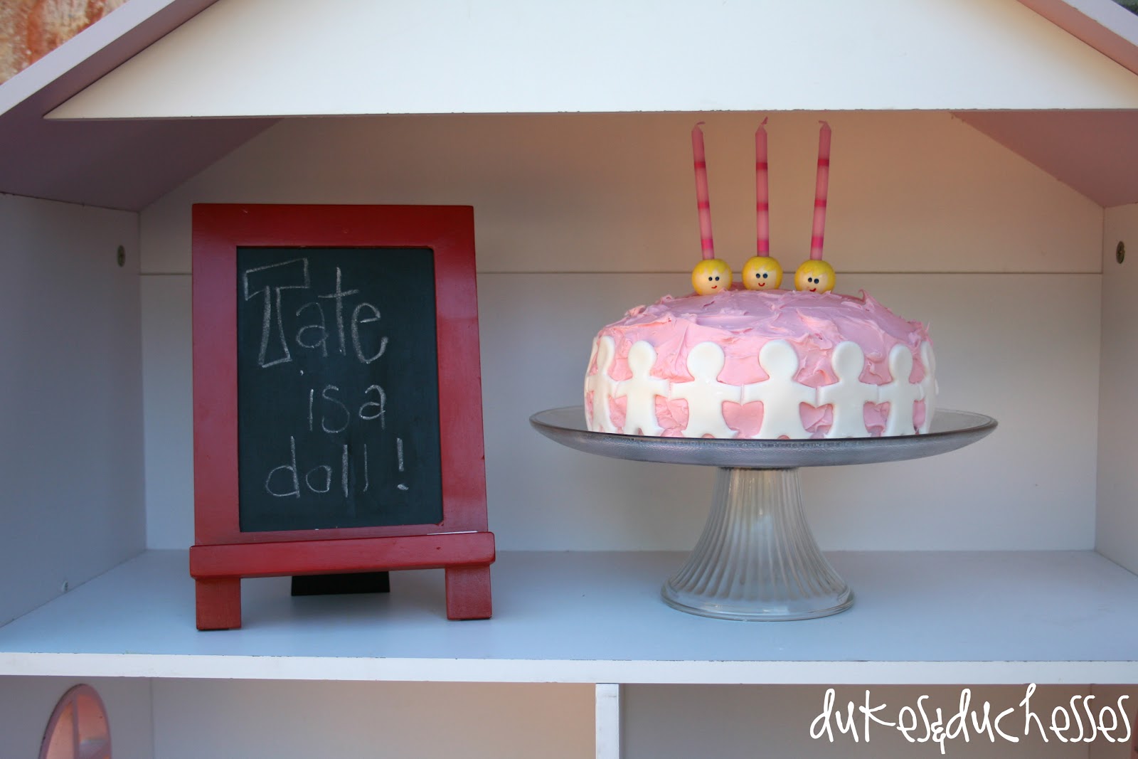 I made a very simple round cake, iced with pink frosting and embellished with fondant paper dolls.