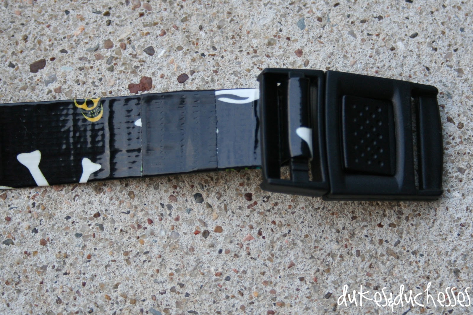 I used a skull print from Duck Brand {technically a Halloween print, I believe, but Luke loves it} to make the belt. I ripped a piece of duct tape a bit longer than his waist measurement and put another thinner piece on top. The thinner piece should be no wider than your buckle and will be the final width of the belt.