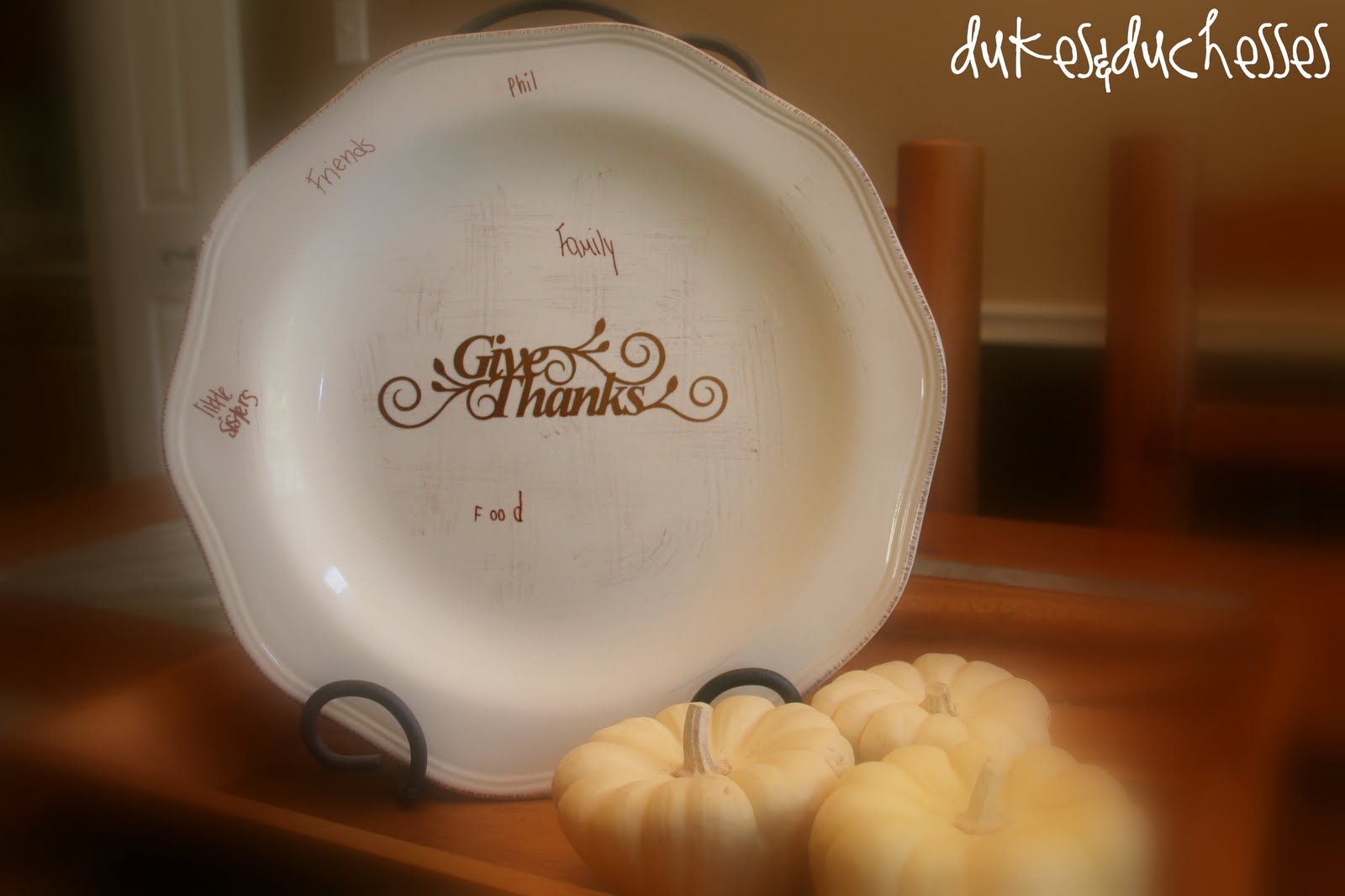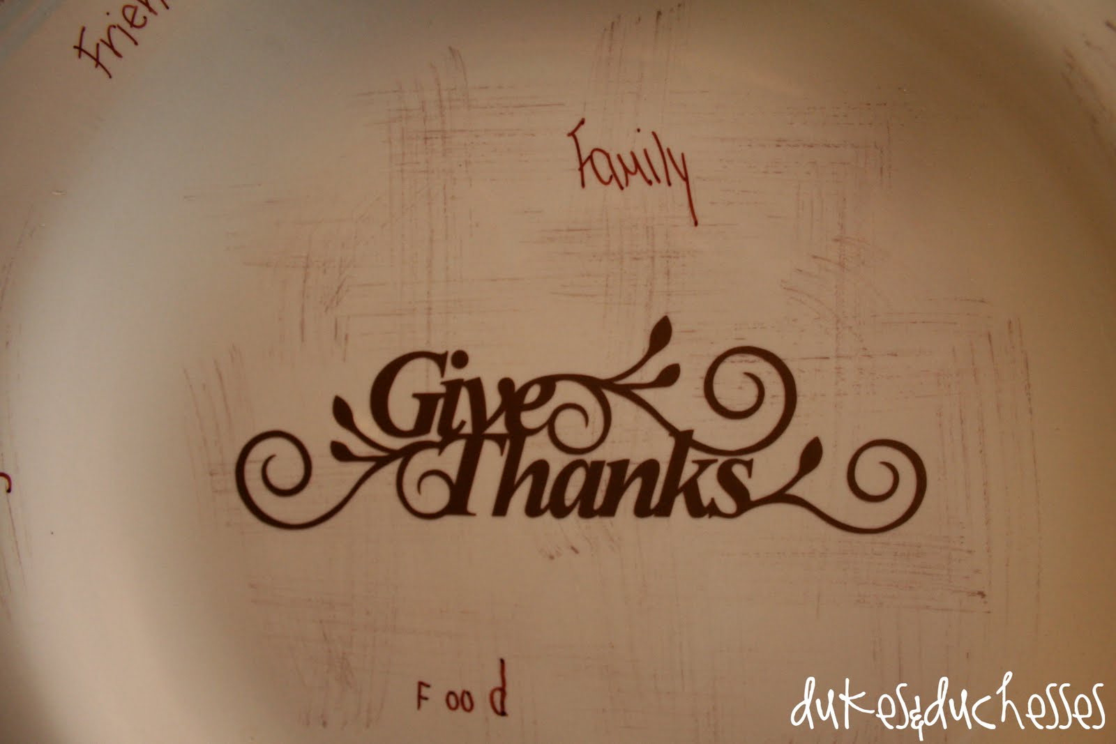 As we feel led throughout the month of November we’ll write our thanks on the plate. We’re writing it in brown Sharpie so it won’t smear off but a little rubbing alcohol at the end of the month will return the plate to its original state. If you don’t want to use a Sharpie, a dry erase marker will work too but it will smudge if rubbed.