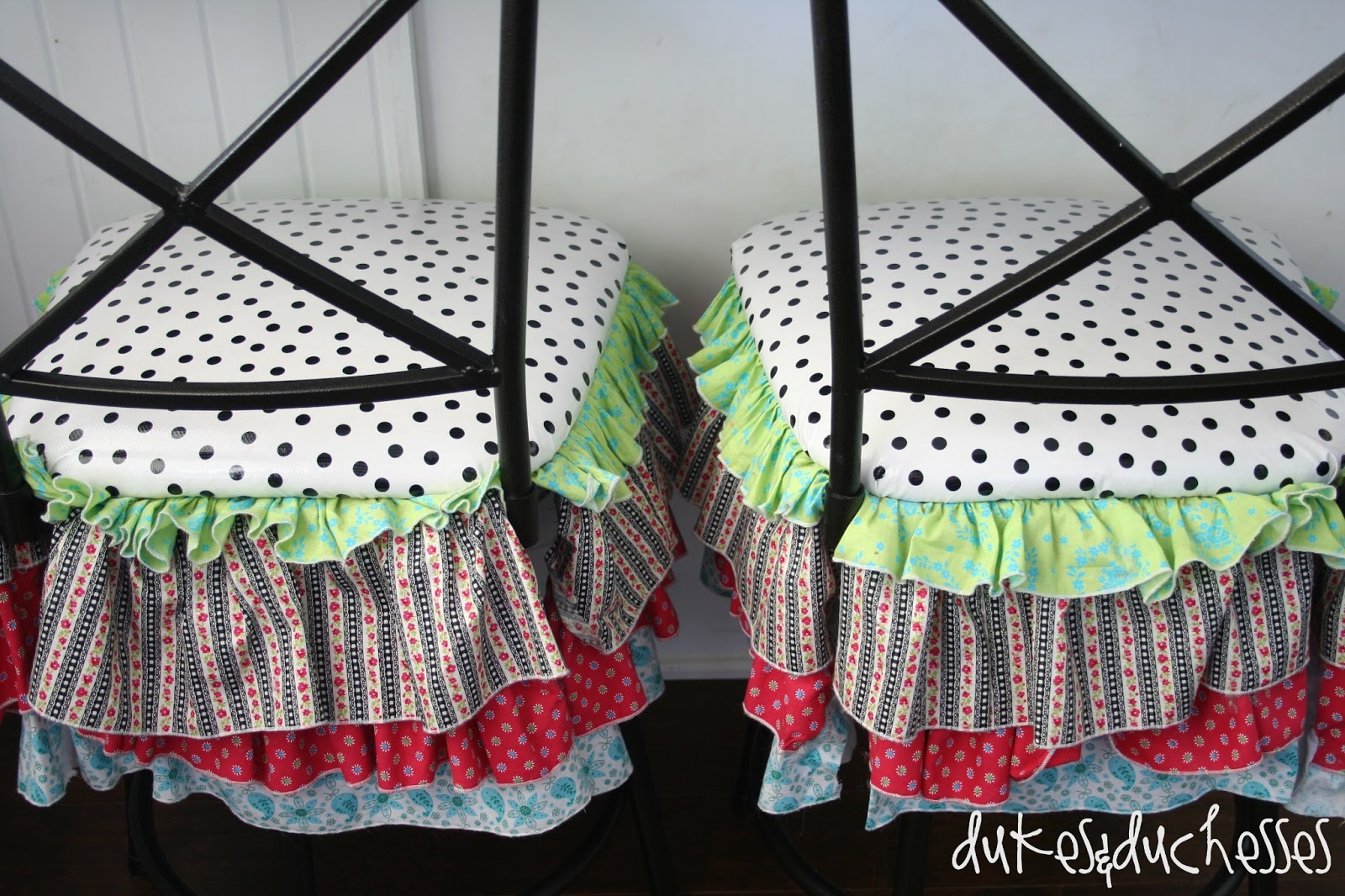Two barstools sit at the breakfast bar. Lori recovered the cushions with oilcloth and added ruffled skirts in colorful fabrics.