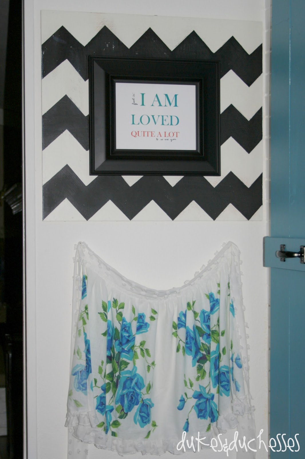 Chevron artwork {made by Lori’s niece} and an apron {made from vintage fabric Lori found at an estate sale in Oregon} adorn a side wall.