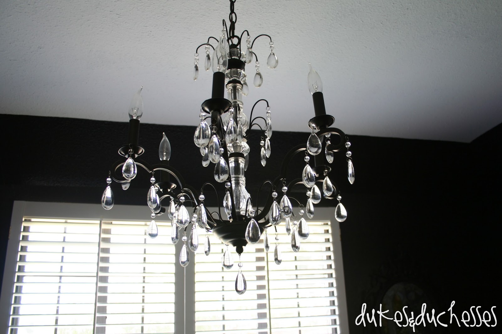 Another chandelier hangs from the ceiling, this one black with crystals.