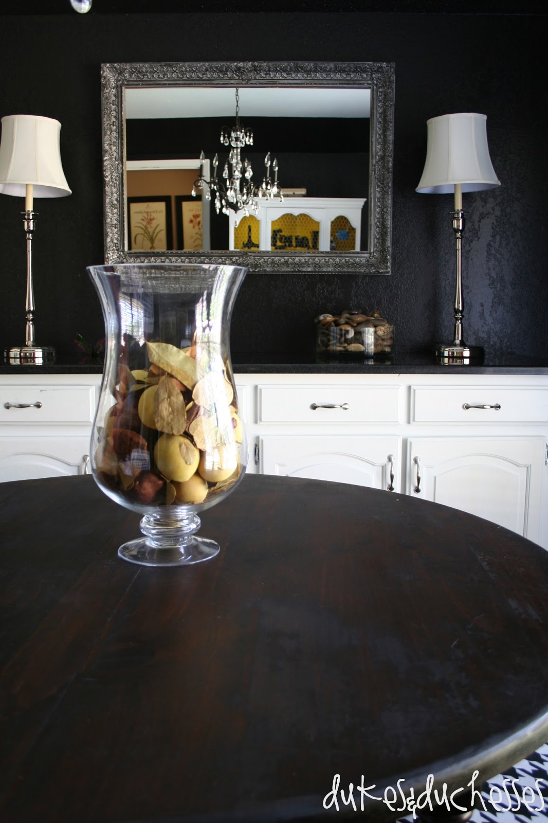 The dining room, formerly a dark green study, now has black walls and pieces that offer a stark contrast. The plantation shutters that fit perfectly on the window were found at a local thrift store for $40. Lori claims they’re her best find ever.