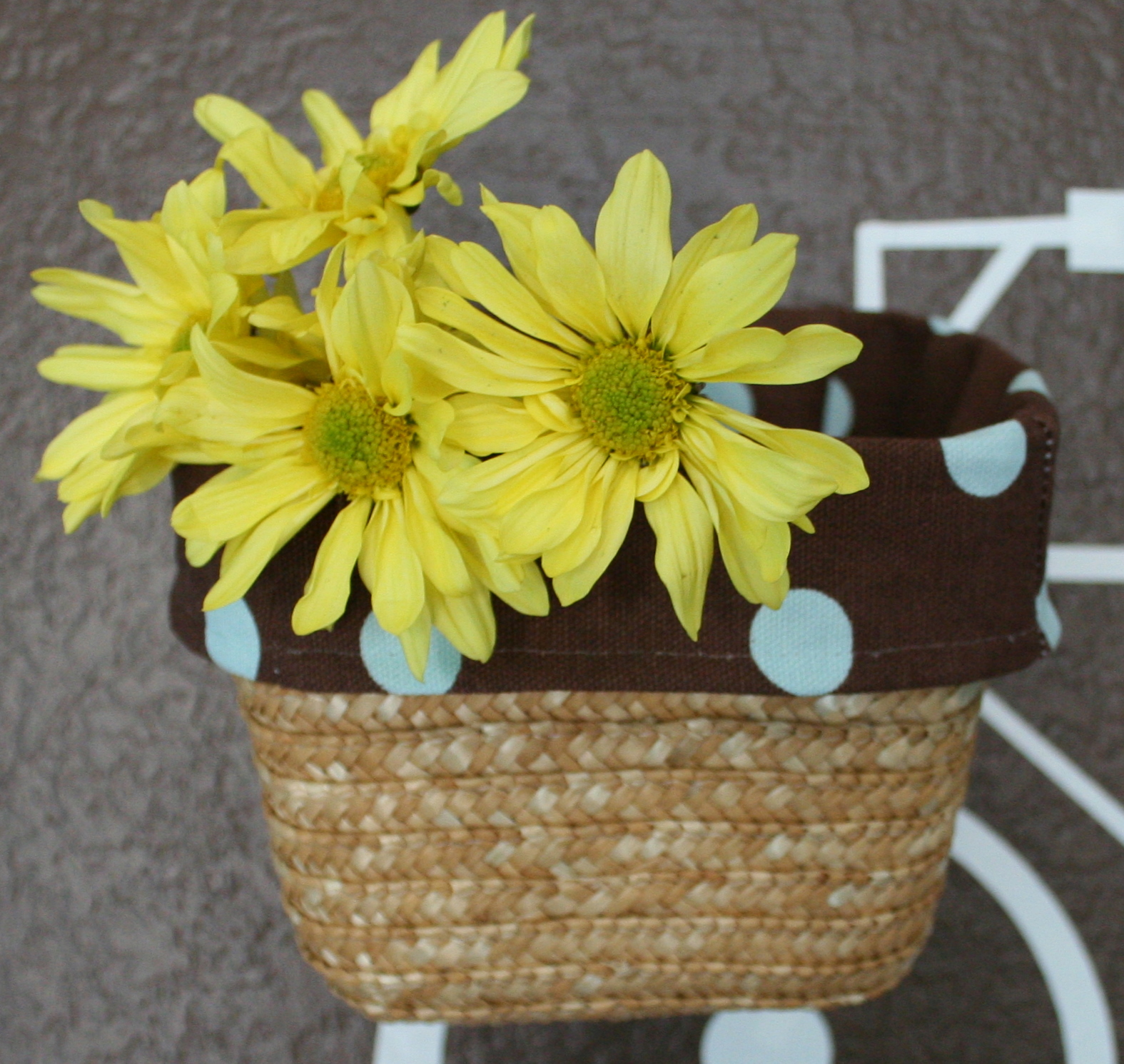 My version {a side view rather than the front view} is made from white vinyl so it’ll show well on this brown wall in Kennedy’s room. I cut the handles off a little basket and sewed a brown and blue polka dot liner for it.