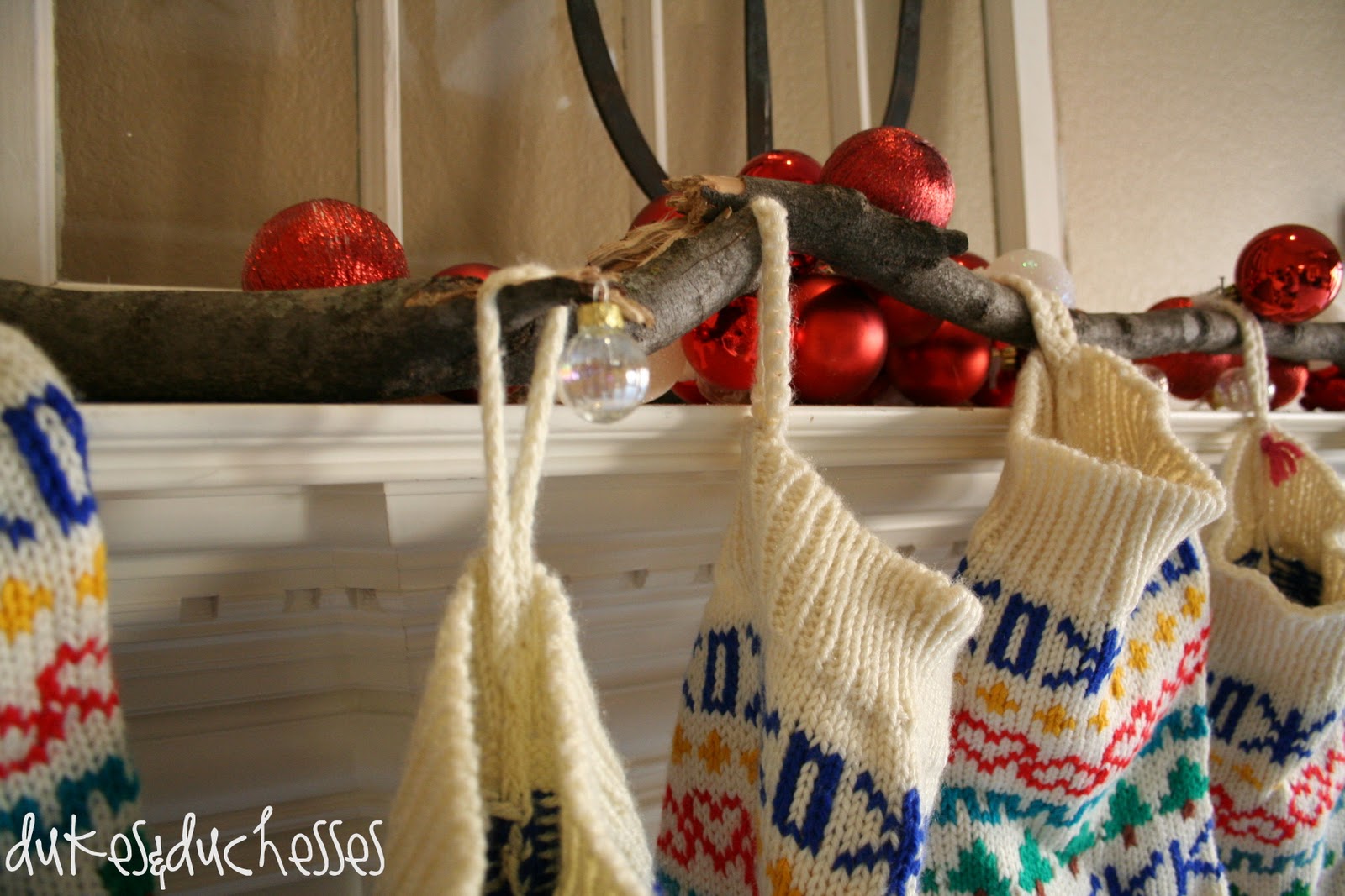 I went to our local park and found an old branch that I repurposed as a stocking holder. The smaller, broken branches make perfect hooks for our knit stockings.