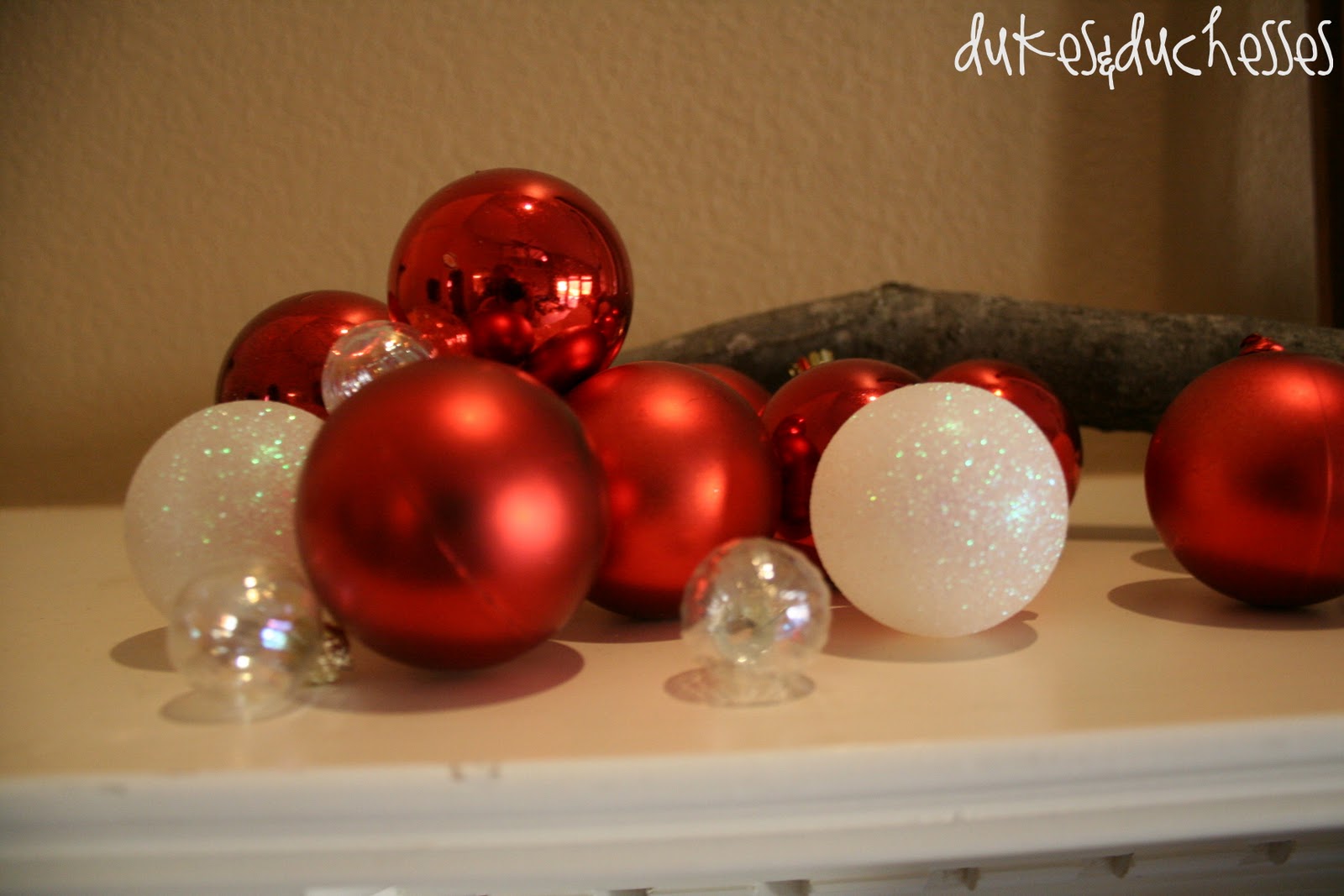 I set piles of sparkly bulbs around the log and decided it was perfect. It might be my favorite stocking holder ever. There’s just something about the rustic feel that feels just right to me this Christmas.
