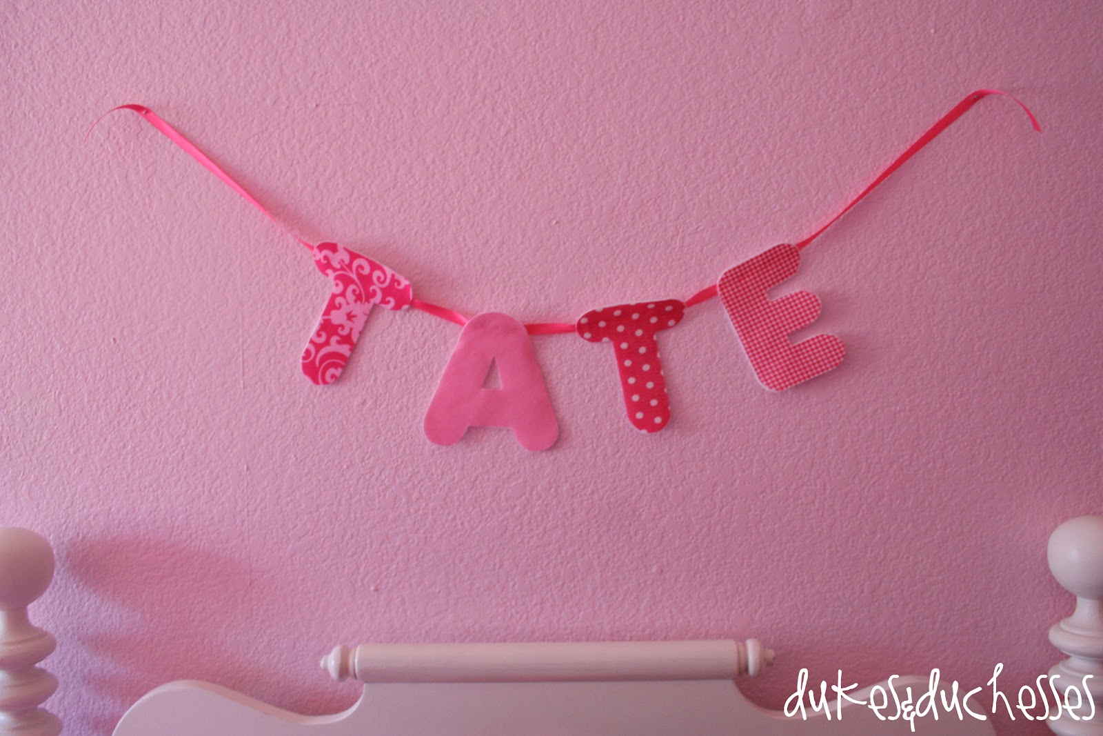 Use a glue gun to attach the letters to ribbon and hang them up on the wall.