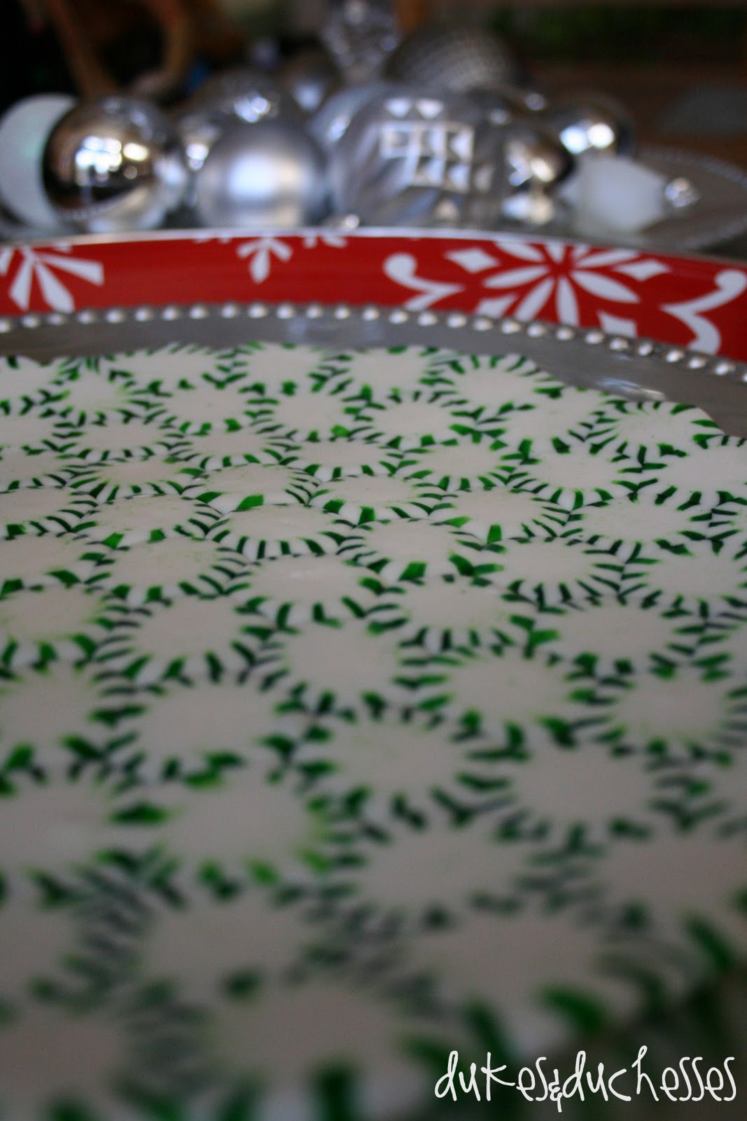 I first saw a peppermint serving tray idea in an old Southern Living magazine and I loved the festive look of it. What a beautiful foundation for a cheesecake or a holiday dessert, or anything, for that matter. Wouldn’t a neighbor be delighted to receive cookies delivered on a peppermint platter? And you might be surprised at how easy it is to make this festive peppermint plate!