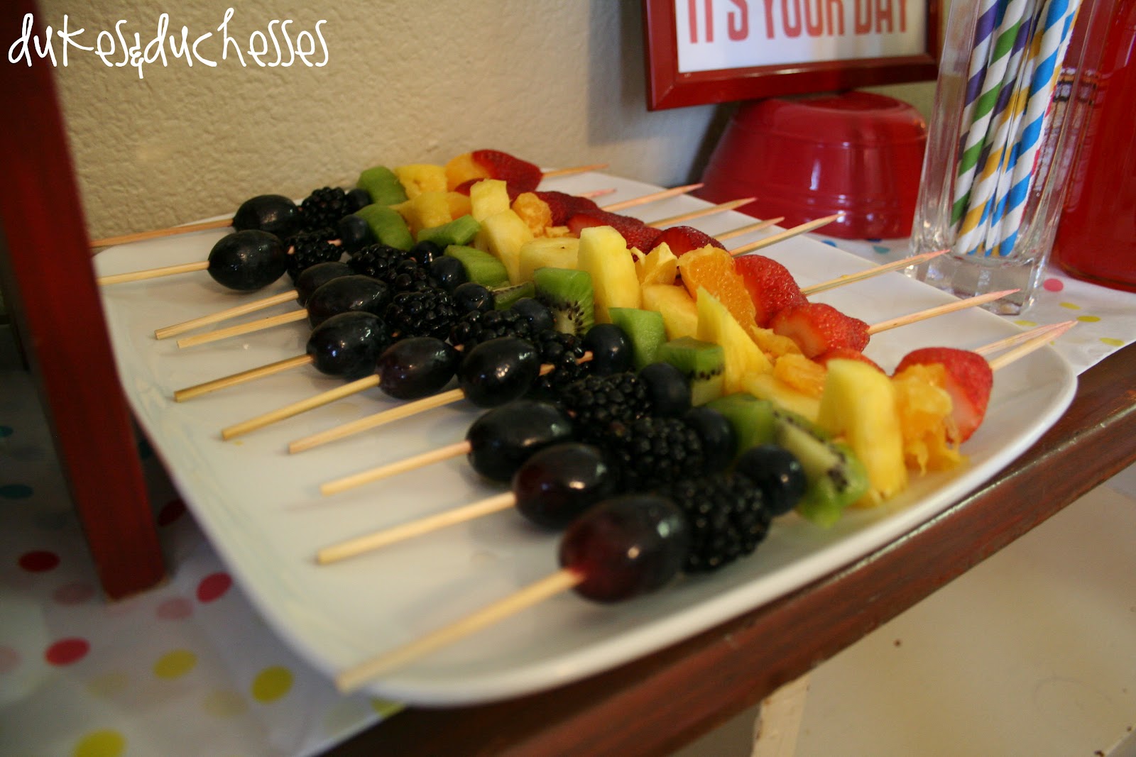 Rainbow fruit kebabs {inspiration} were on the menu along with orange,cheesy popcorn, rainbow goldfish, sprinkled cookies, and an assortment of rainbow candy.