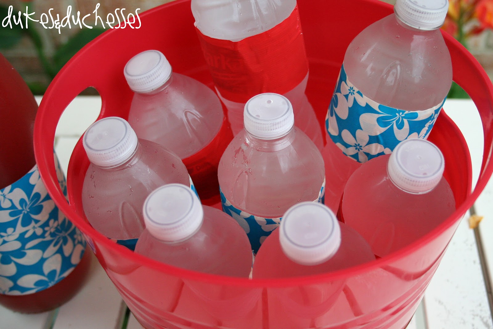 The water bottles got duct tape labels as well. Duct tape is one of my favorite things to wrap around water bottles because, unlike a paper label, it repels the water and stays intact. With all the great prints available in duct tape, you can match any party theme.
