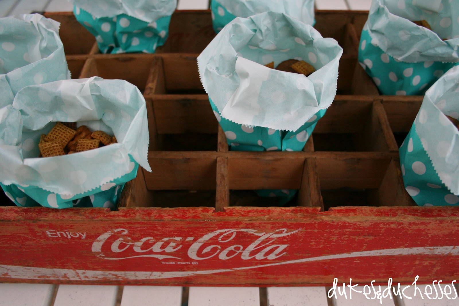 … and polka dot bags filled with snack mix. My Coke crate made yet another appearance at a party … I love this thing!