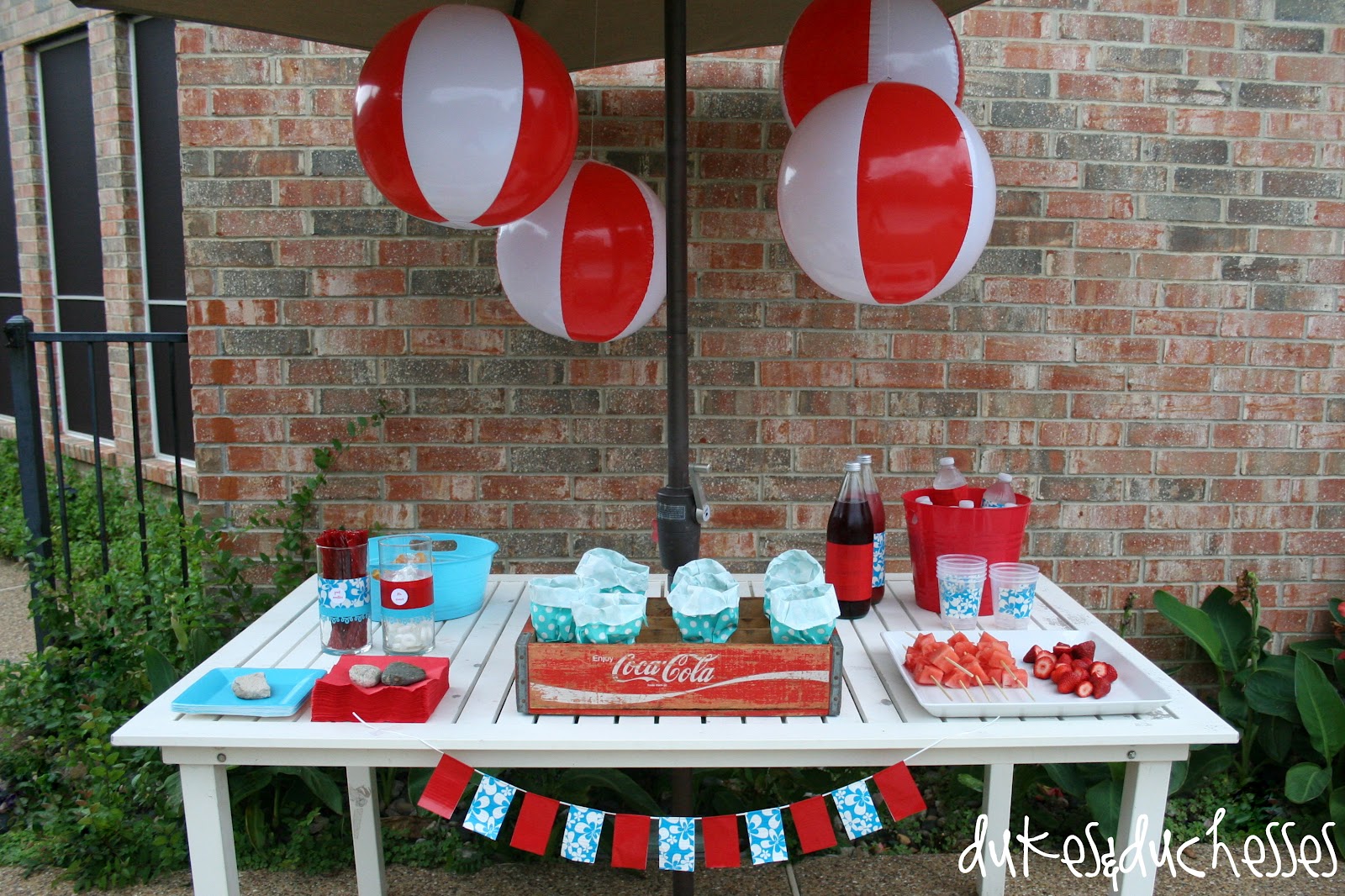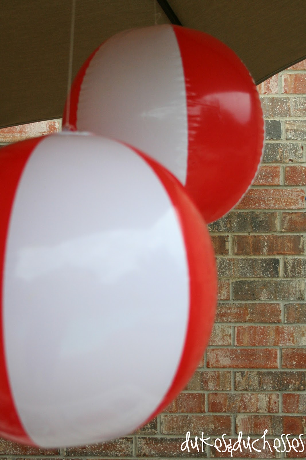 … and hung red and white beach balls from the umbrella over the table.