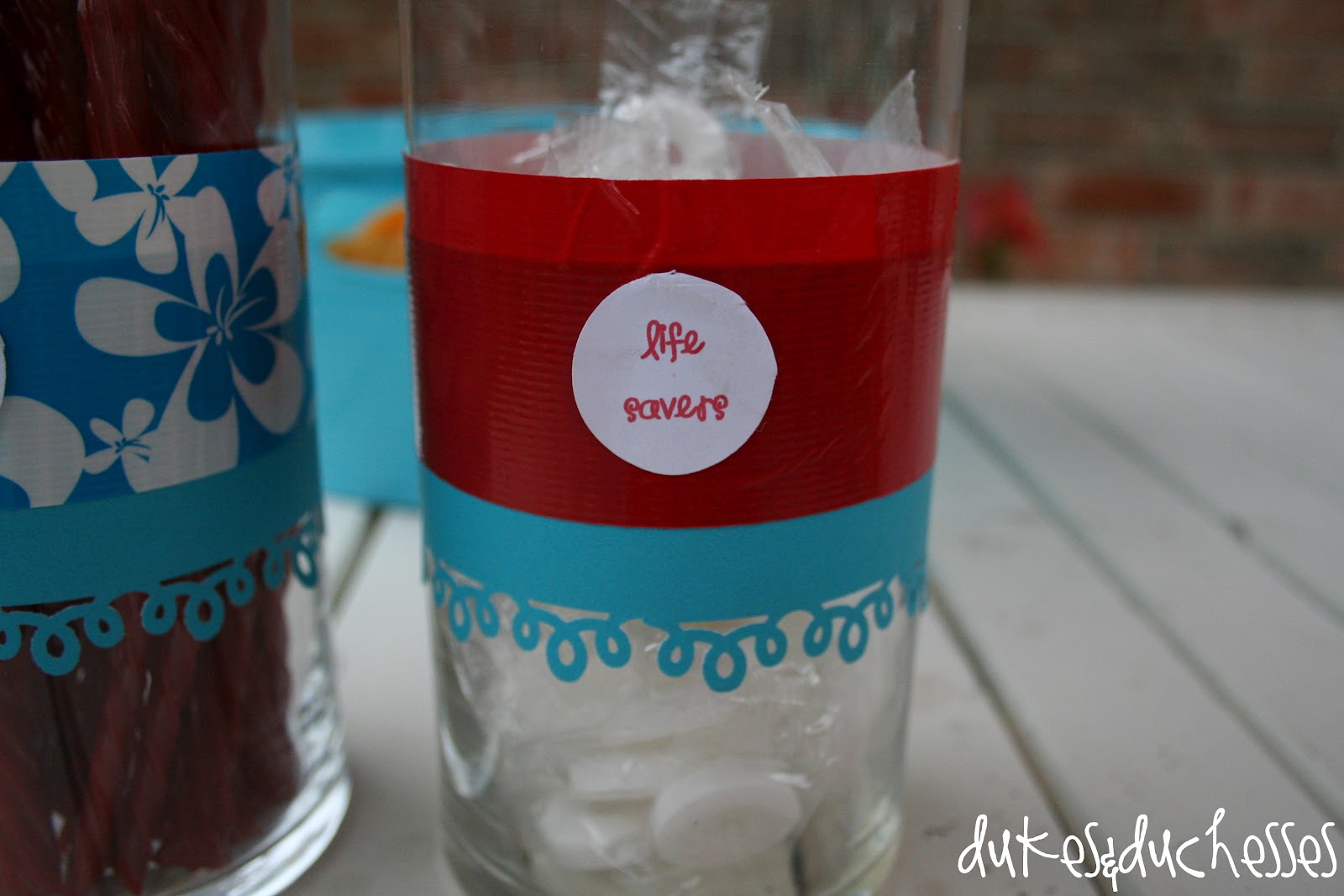 … and minty “life savers” were served in containers embellished with paper and duct tape. The paper was cut on one edge with a paper punch.