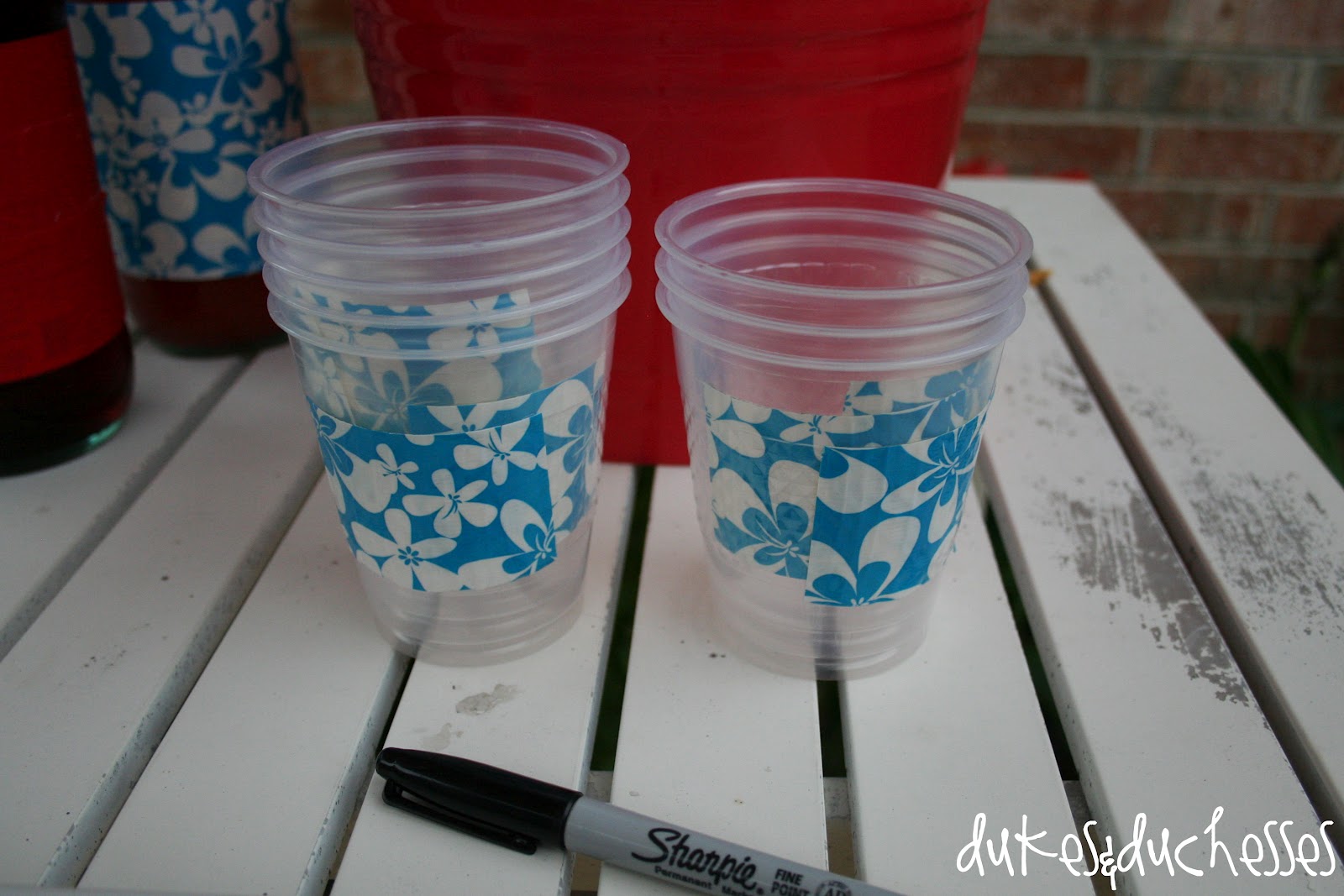 I also added pieces of duct tape to the cups and set a Sharpie nearby. The girls wrote their names on the duct tape labels to avoid cup swapping.