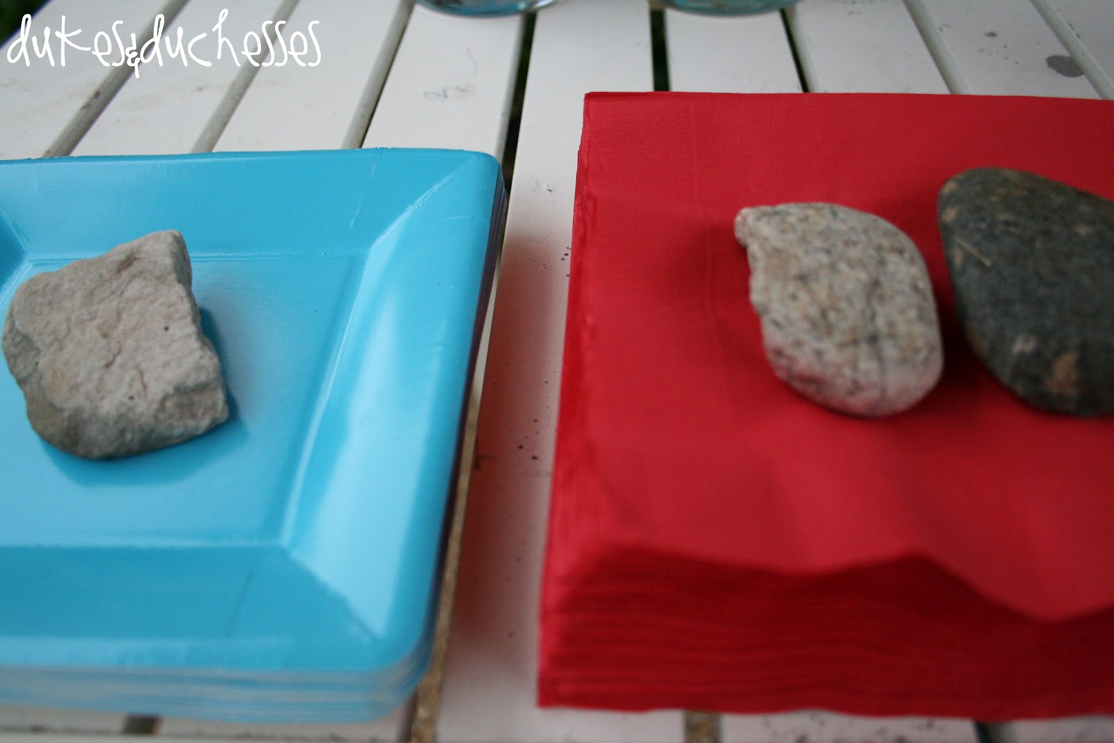 Turquoise plates and red napkins were held down with rocks {a little natural element I use at a lot of outdoor parties} …