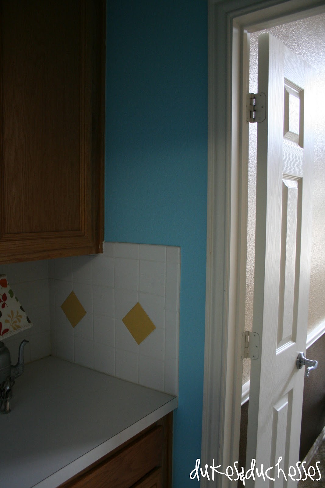 I went bright and used my True Turquoise paint sample from Glidden. It looks great against the white doors and the yellow, tea-stained kitchen walls …
