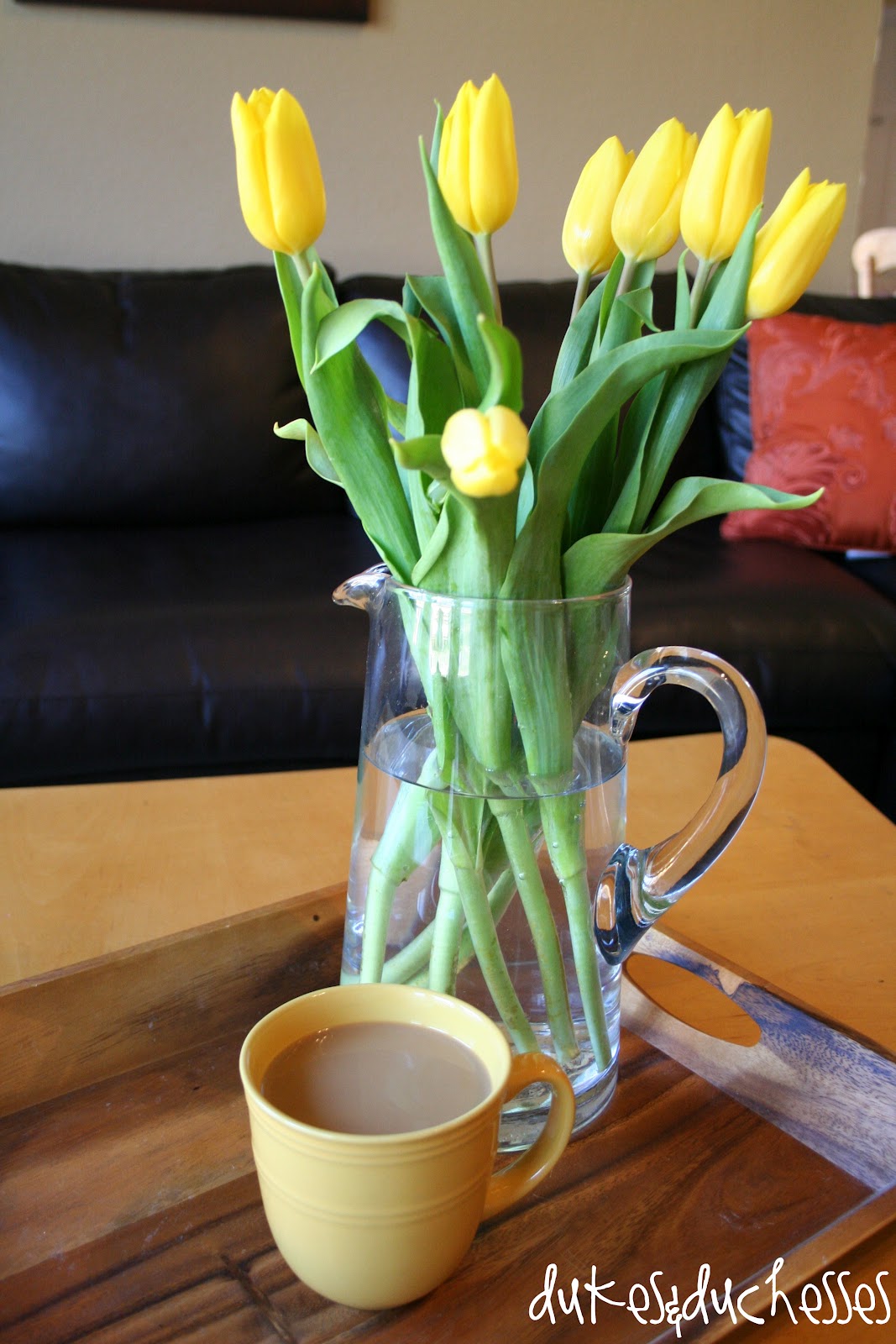 And spring always makes me think of bright colored flowers. A pitcher full of yellow tulips is just so cheery. Add a cup of coffee in a vibrant mug and I’m one happy girl. I may have sent the kids outside to play while I enjoyed that cup of coffee in peace, leaning back on my new cushions.