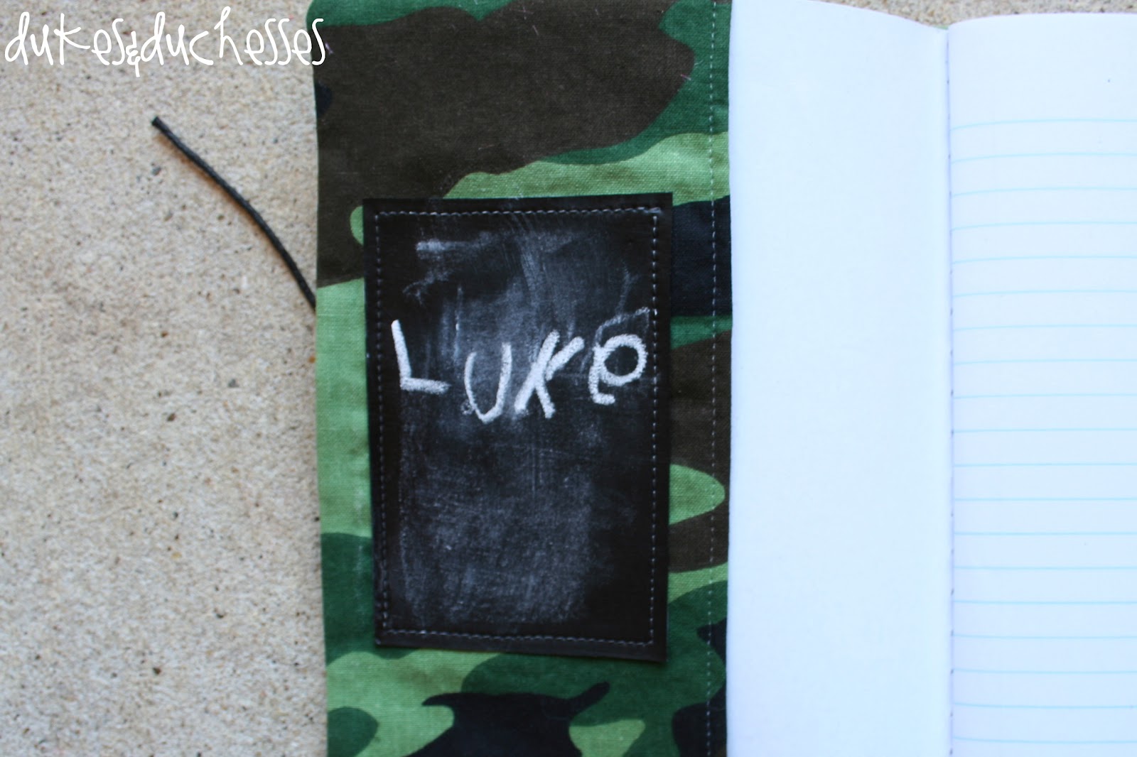 I started with a simple lined notebook and sewed a camouflage cover for it. I kept it super simple with a rectangle for the outer cover sewn to two other small rectangles that the notebook cover slides into {you can sew a similar cover by measuring your notebook and then adding a seam allowance to each piece}. You can see the inside cover below.