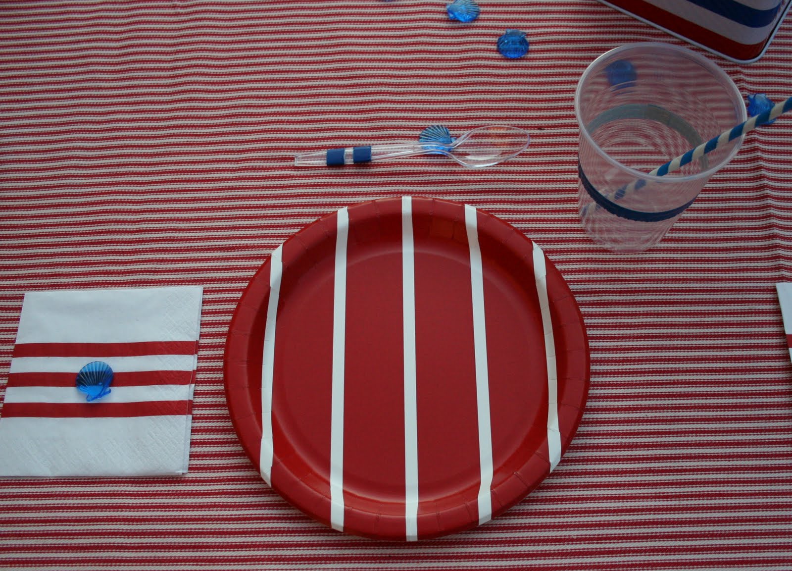 When I think of summer, I think of fresh, bright colors. My tablescape used primary colors and stripes going in lots of directions. Red ticking covered the table and striped paper goods sat at each spot. I chose paper products so the party could be quickly cleaned up and the fun could carry on outside, not in the kitchen.