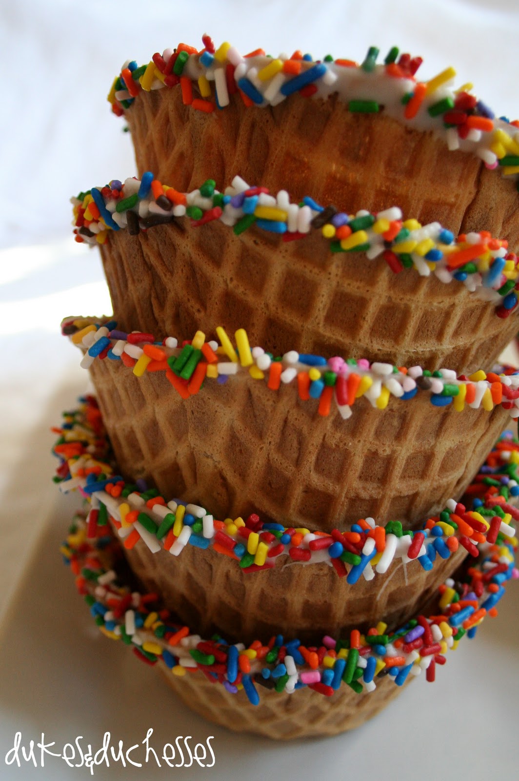 I bought ready-made waffle bowls and added a bit of fun by dipping the edges of the waffle bowls in white candy melt, then in colorful sprinkles {you could use a color or a shaped sprinkle to match any party theme}.