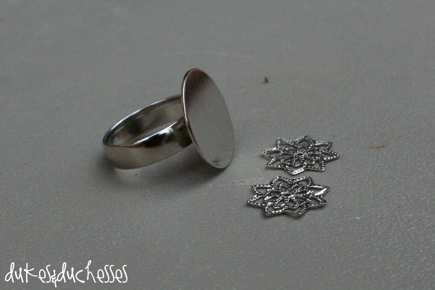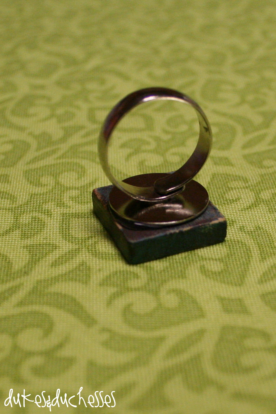 After I had a color I was happy with, and it was dry, I hot glued a ring onto the back. You can find the rings in the jewelry section of any craft store. You don’t want a base bigger than 18 mm or it’ll show from the sides and front.