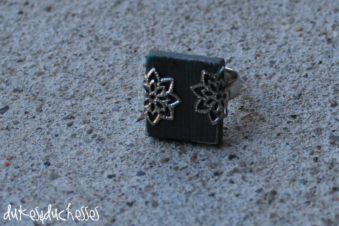 After I made my scrabble tile ring {inspired by this beauty} at the Pinterest party, I had some requests for a tutorial. Let me say that this is the bohunk version of the real deal that you can buy on etsy but I’ll tell you what I did.