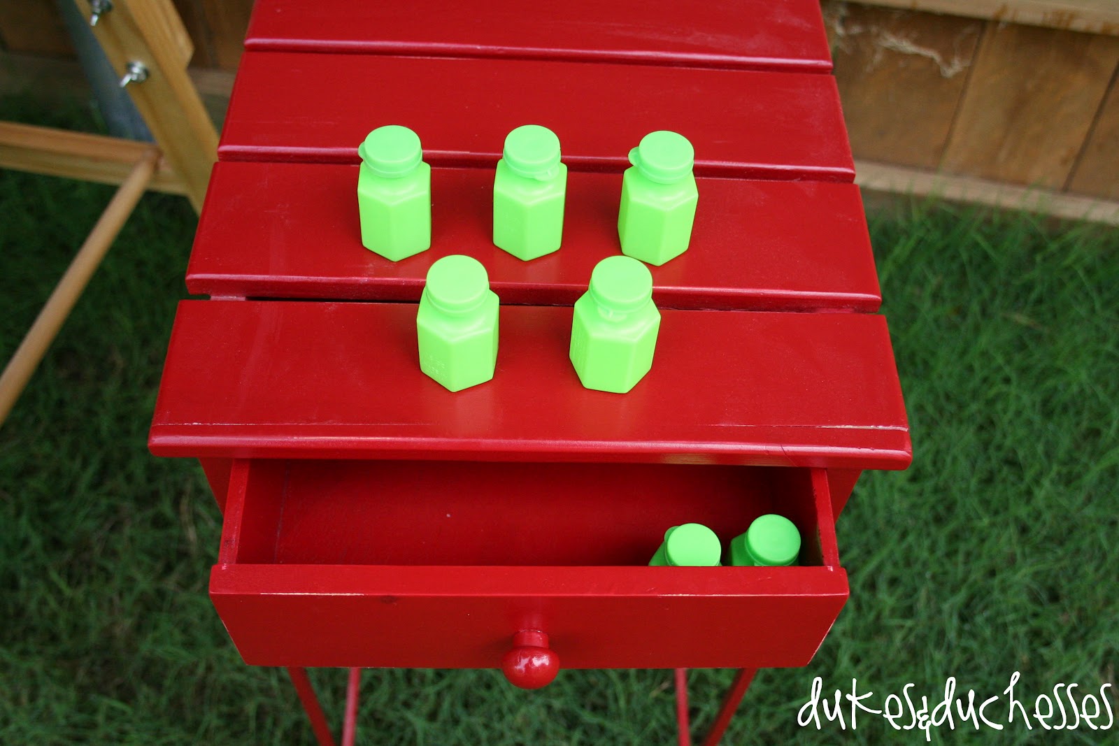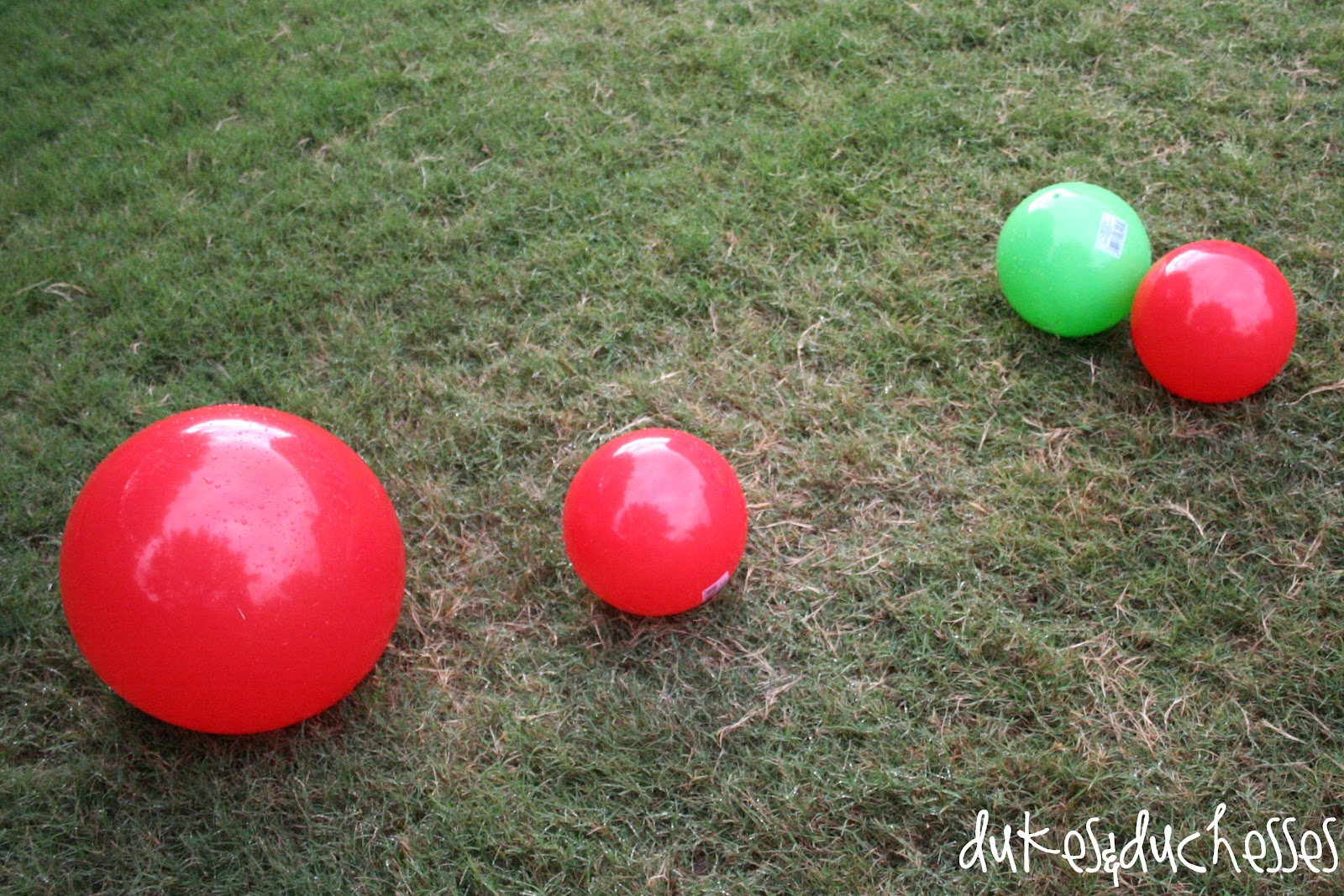 Inspired by a birthday party shared by Pottery Barn, I copied the hanging caterpillar idea but made it from balloons instead of paper lanterns. Scrapbook paper completed the face {pardon his droopy antennae}. I put a marble inside each balloon to weight it down and used ribbon to hang the balloons in a row from a tree branch. This balloon caterpillar would make a really cute backdrop for a food table but I hung it over the table where the kids would sit to eat.