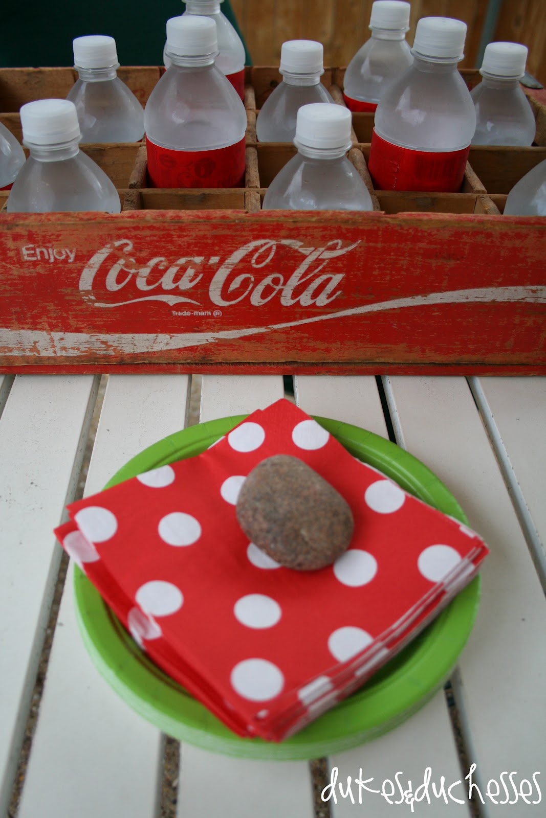 The table was decorated very simply in bright green and red. I used layers of ragged fabric and paper plates and napkins. Clean rocks weighted down the plates so they wouldn’t blow away, an idea I use a lot for outdoor gatherings.