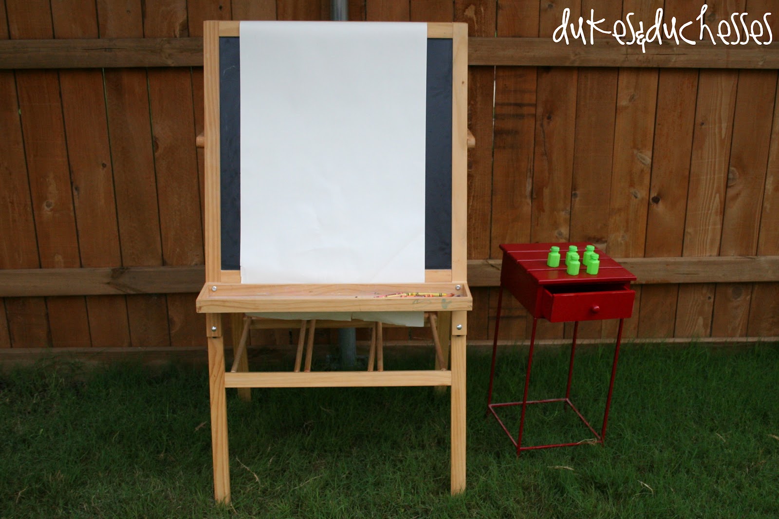 I provided a few simple stations to inspire some toddler play: an easel with paper and crayons …