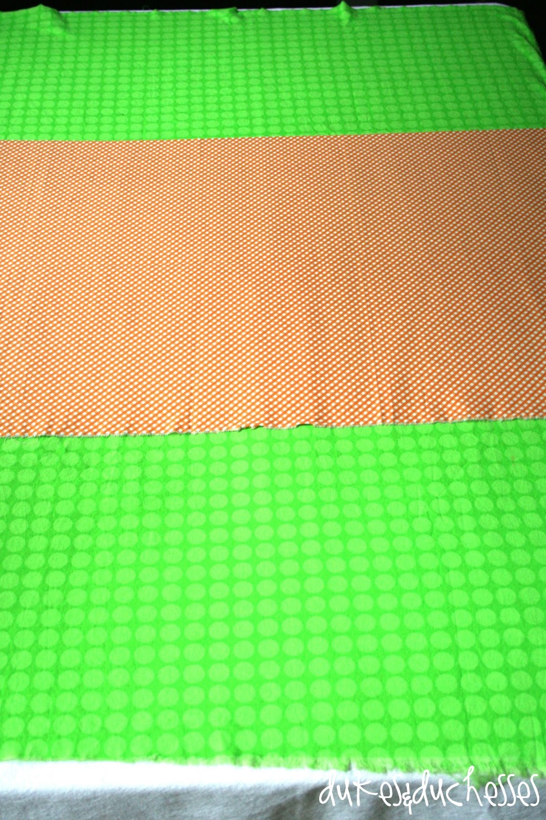 I started out by covering a small table with bright fabric from my stash. I layered it and left the edges raw on the runner because I’m all about casual.