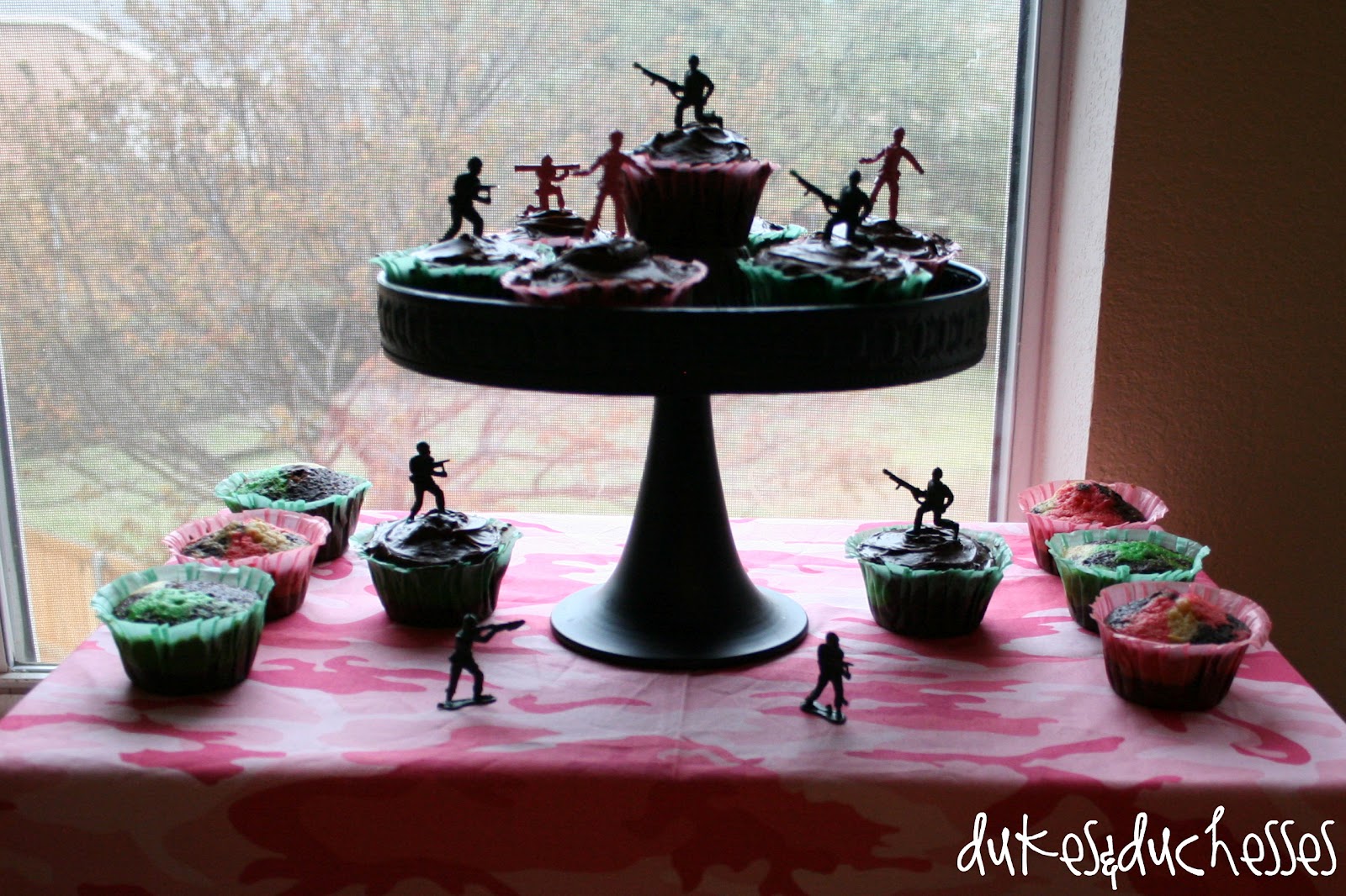 … and army men {also found at the dollar store} were strategically placed around the table. I spray painted some of the army men pink. Pink army men make me smile.