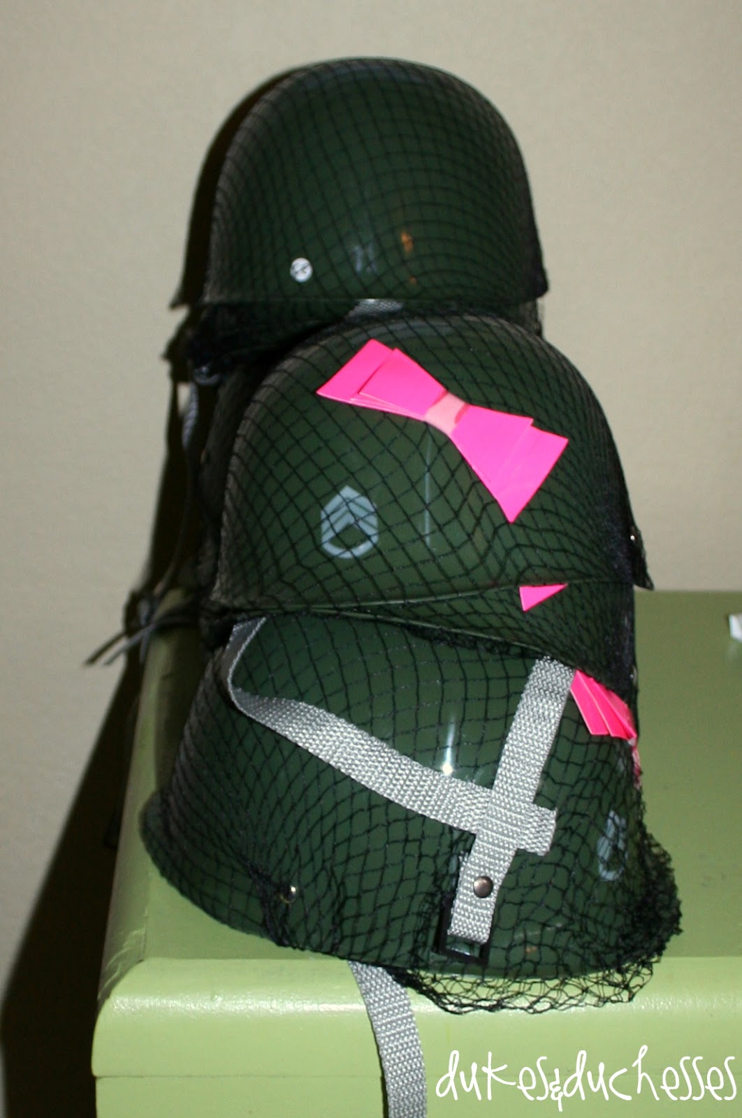 I had a stack of army helmets for the kids {with pink duct tape bows on the girls’ helmets}.
