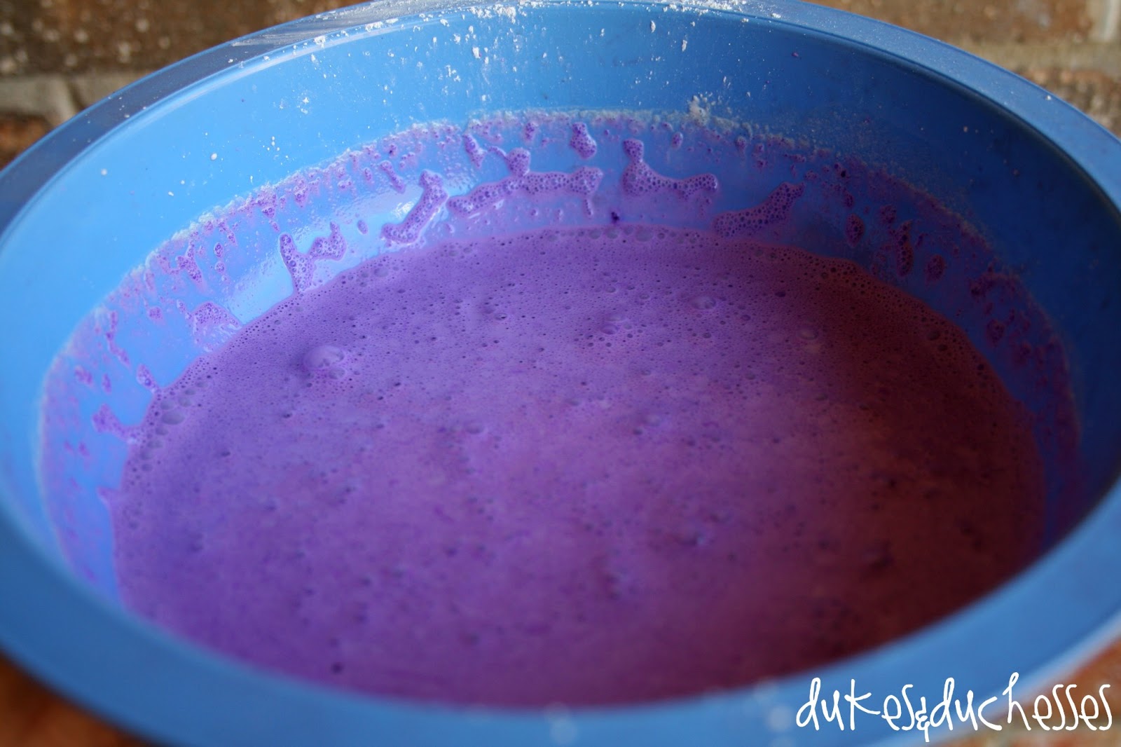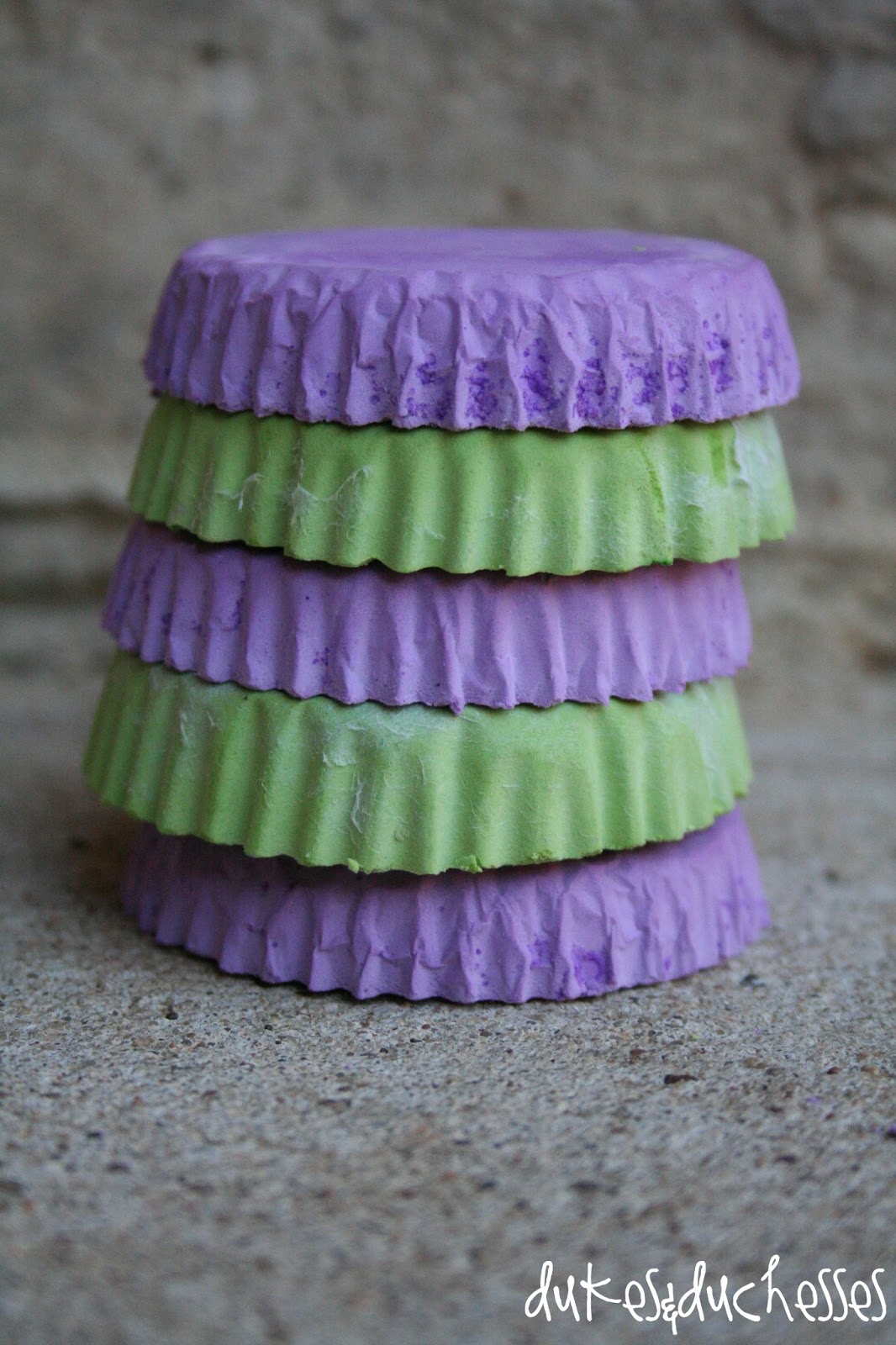 To make your own sidewalk chalk, you’ll need Plaster of Paris, powdered tempera paint, water, and a mold of your choice {this time around I used cupcake wrappers in a muffin tin but I’ve used fun molds in the past}.