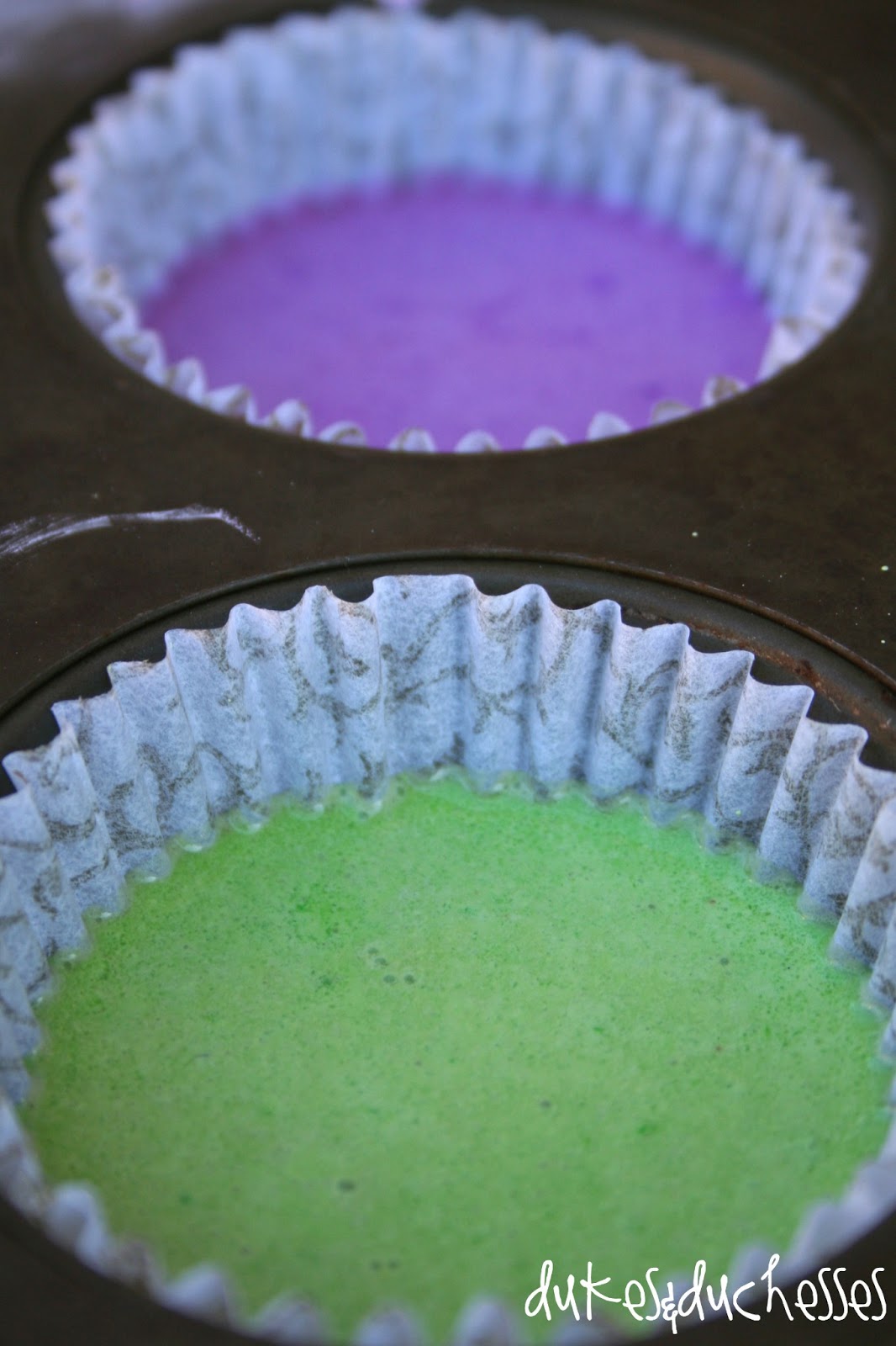 Pour into your molds. Just a note: this photo shows paper cupcake wrappers but I would only recommend using foil cupcake wrappers {without the paper inserts} … they peel off more easily at the end.