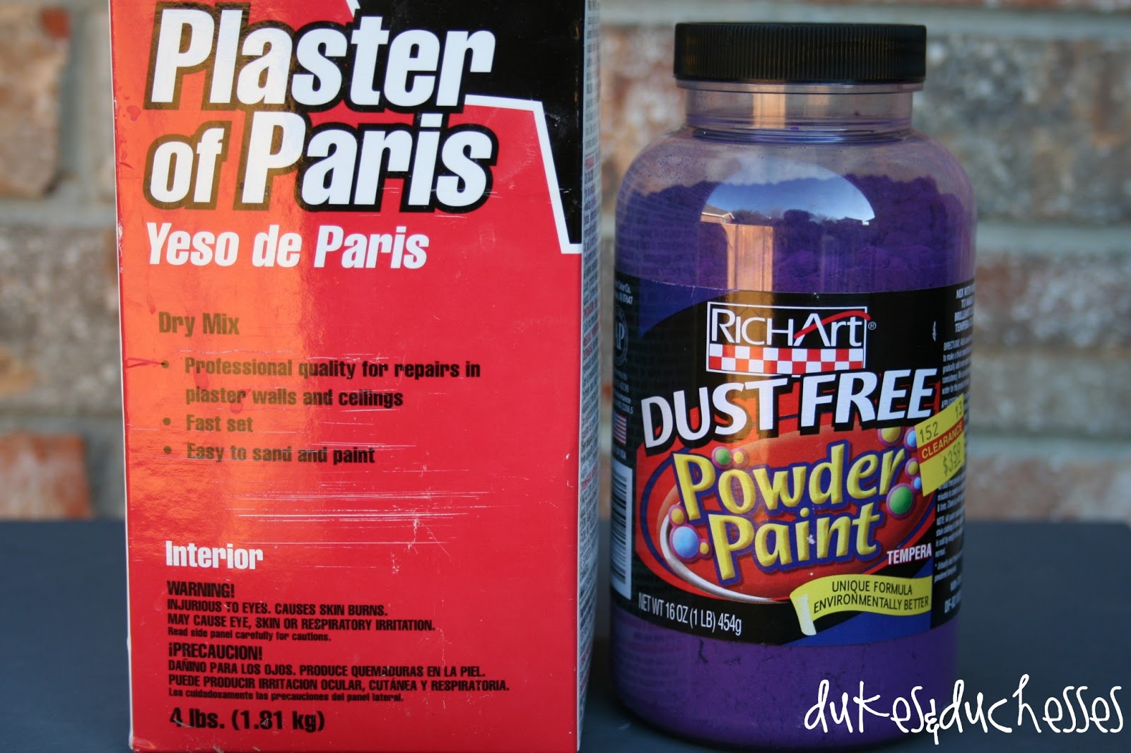 Mix 1 cup of Plaster of Paris with 1 cup of water. Stir well {I use a whisk} until the lumps are gone and then add tempera paint powder until you have the color you want.