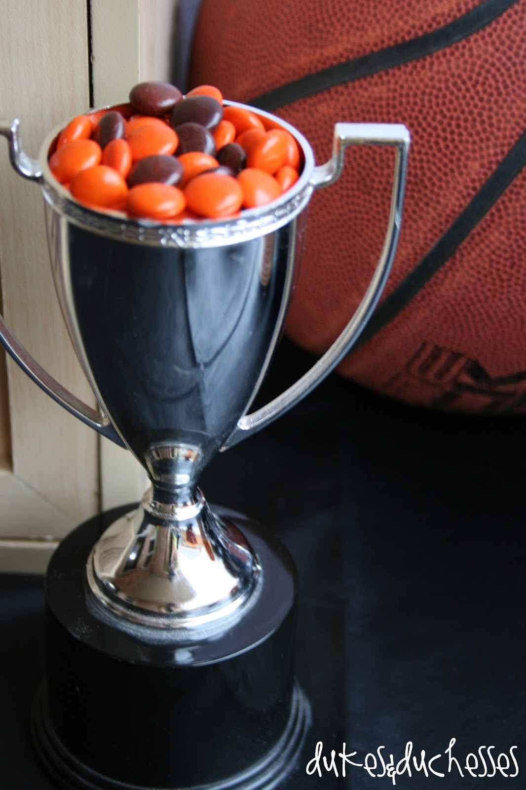 … poured some Reese’s Pieces into an old trophy cup we had hanging around {I love to shop around my house and find items to use for tablescapes and decor} …