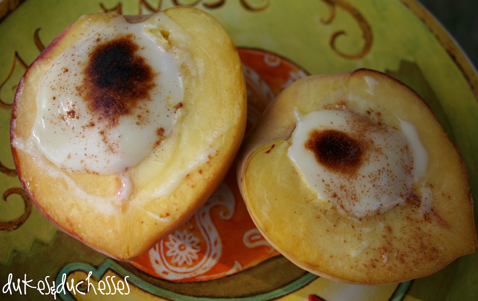 To make them, cut fresh peaches in half and remove the pit. Place them in an oven-safe pan. In the center of each half, place a dollop of Philadelphia White Chocolate Indulgence and sprinkle lightly with cinnamon.