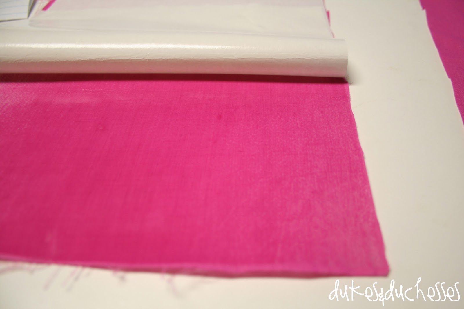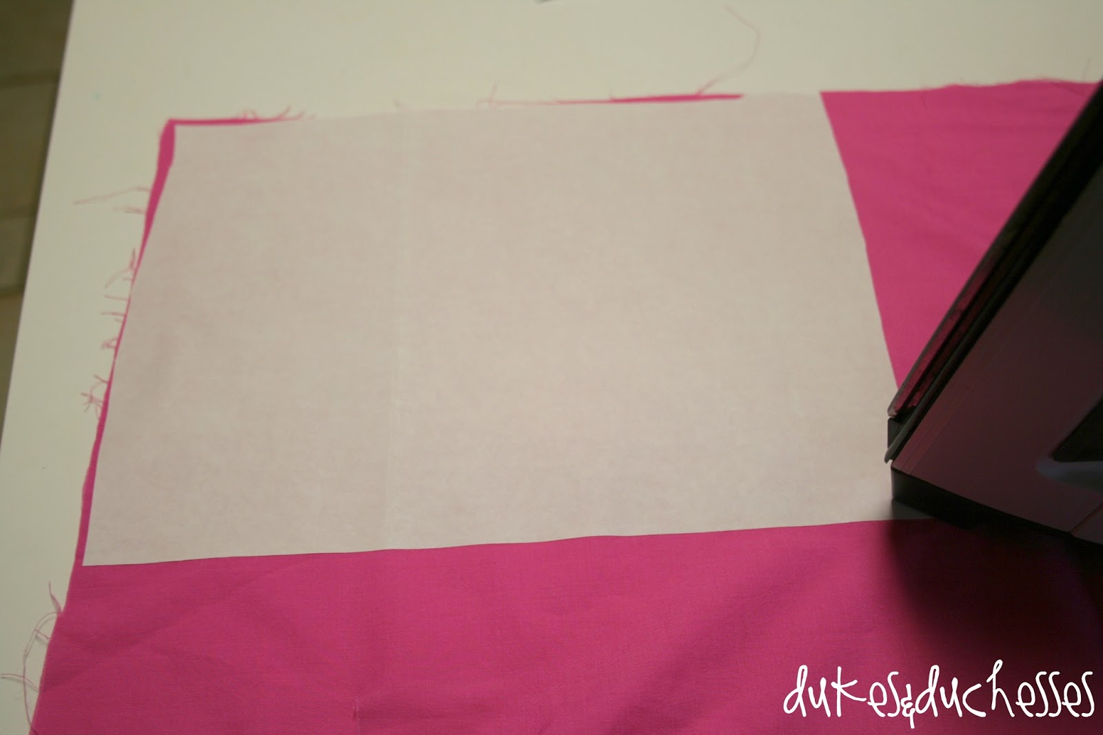 Once the supplies are assembled, apply the fabric interfacing to the back of each piece of fabric. To apply it, you simply place the bumpy side against the back of the fabric and fuse it with the iron for two seconds. It adheres quickly and easily.