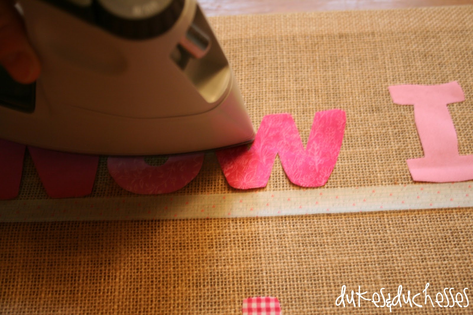 I used the tip of my hot iron to tack down each letter then pulled the tape up and pressed the letters down to adhere them completely.