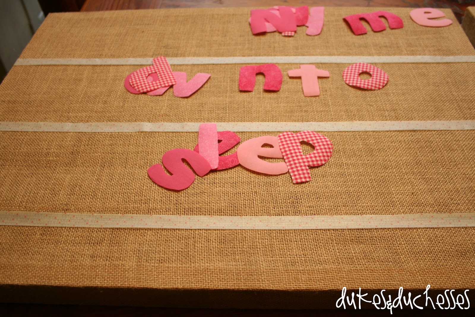 Once I had all of the letters cut, I used tape {cute washi tape, of course} to make temporary placement lines on the burlap board …